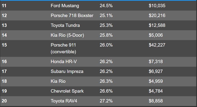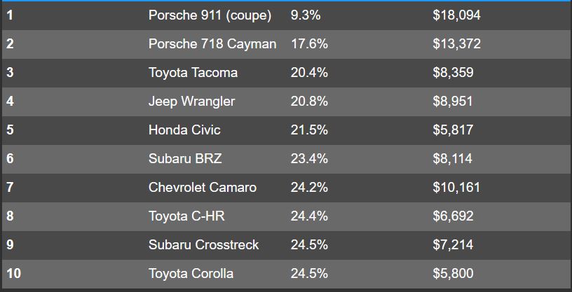 Phần còn lại trong top 10, không mấy ngạc nhiên, chủ yếu là xe Nhật. Chúng bao gồm Toyota Tacoma (thứ 3, 20,4%), Honda Civic (thứ 5, 21,5%), Subaru BRZ (thứ 6, 23,4%), Toyota C-HR (thứ 8, 24,4%), Subaru Crosstrek (thứ 9, 24,5%) và Toyota Corolla (thứ 10, 24,5%). Số còn lại trong top 10 là xe Mỹ bao gồm Jeep Wrangler thứ 4 (20,8%) và Chevy Camaro thứ 7 (24,2%).