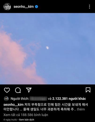 Cho đến thời điểm hiện tại, khi vụ ồn ào đã lắng xuống, Kim Seon Ho mới trở lại mạng xã hội sau gần 7 tháng ở ẩn. Trên Instagram cá nhân, nam tài tử sinh năm 1986 gửi thông điệp đến người hâm mộ nhân dịp sinh nhật mình 8/5. Anh viết: "Tôi rất xin lỗi vì đã khiến mọi người trải qua khoảng thời gian khó khăn vì sự thiếu sót của mình. Tôi vô cùng cảm kích vì sinh nhật năm nay mọi người cũng đã gửi lời chúc sinh nhật quá đỗi lớn lao như vậy. Tôi sẽ cẩn thận lưu giữ những tình cảm nhận được và sẽ nỗ lực trở thành một diễn viên có thể báo đáp được sự ủng hộ của các bạn".
