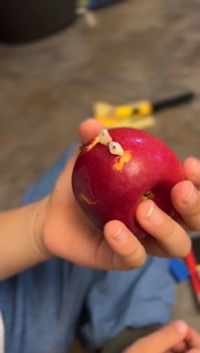 Theo đó, bé trai có 2 chiếc răng cửa lung lay và phải nhổ đi. Thay vì dùng chỉ hay đi nha khoa, mẹ đã đưa cho bé trai một quả táo, khi bé trai cắn vào quả táo ấy cũng là lúc 2 chiếc răng cửa được xử lý.
