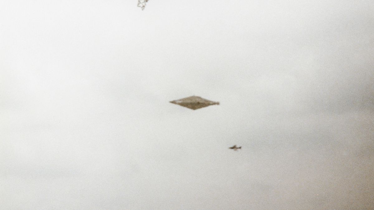 "Bức ảnh Calvine" mới được công bố cho thấy một vật thể lớn hình kim cương trên trời, và một vật thể khác giống máy bay phản lực Harrier cách đó không xa.