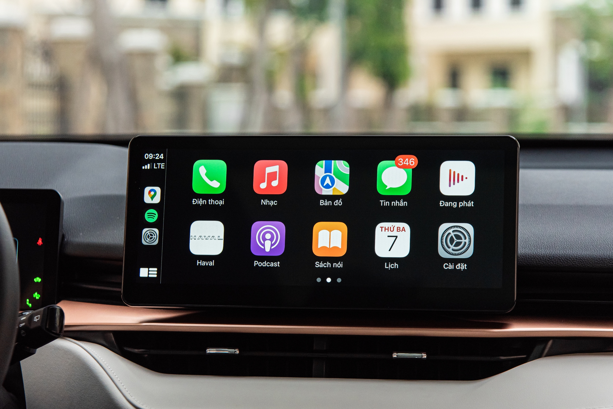 Màn hình giải trí 12,3 inch đặt tại trung tâm cũng là một điểm cộng của Haval H6 khi có độ phân giải cao, hình ảnh cho ra chất lượng trong trẻo và nét, đặc biệt tông màu đen cho chiều sâu. Tiện ích màn hình nổi bật với khả năng kết nối Apple CarPlay hoặc Android Auto. Tuy nhiên, trong quá trình chúng tôi chạy thử có đôi lần màn hình này không thể nhận kết nối với điện thoại thông minh khiến chúng tôi phải tắt máy xe và khởi động lại.