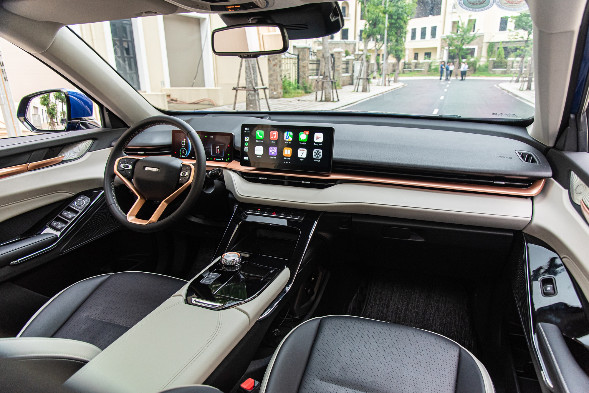 Bên trong nội thất, Haval H6 hướng tới sự tối giản khi không xuất hiện nhiều nút bấm vật lý. Xung quanh cabin được nhấn nhá bởi tông màu vàng đồng khá đẹp mắt. Tuy nhiên khi sờ thực tế thì đây chỉ là nhựa được sơn màu giả kim loại. Nếu Haval thay bằng chất liệu nhôm thì sẽ cho cảm giác cao cấp hơn. Từ vị trí ghế lái, người ngồi sẽ có tầm nhìn thoáng đãng do vị trí ngồi cao, táp-lô đặt thấp. Điểm trừ khi ngồi lái đó là cột A dày, kết hợp gương xe to bản, vô hình trung tạo ra điểm mù cực lớn khiến lái xe có thể không nhìn thấy các phương tiện khi đi ngang các ngã giao cắt.