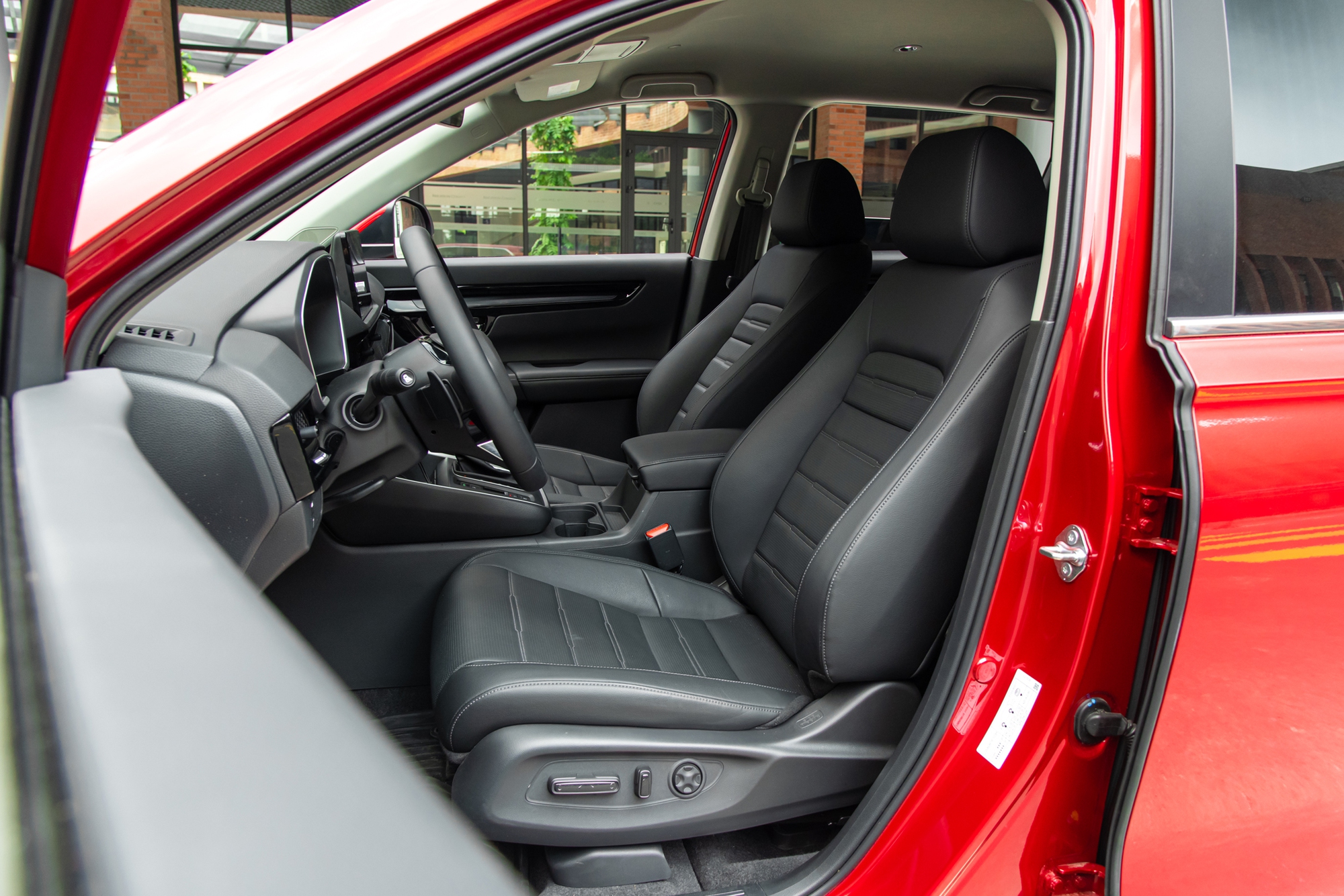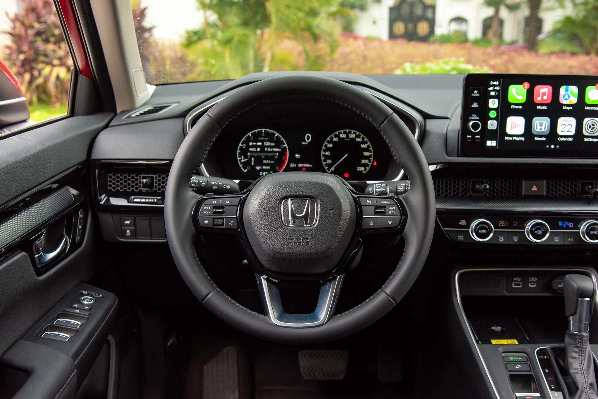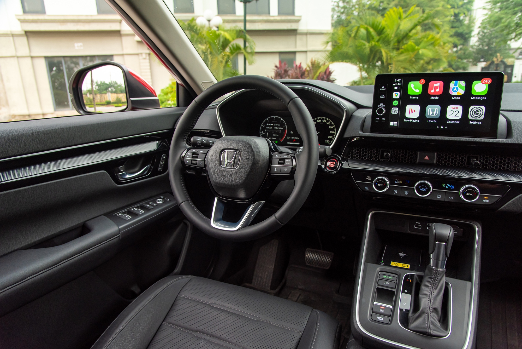 Lên xe, đóng cửa, Honda CR-V tạo cảm giác chắc chắn, tiếng cửa êm tai hơn một số đối thủ cùng phân khúc. Nhắc lại đôi chút về thông số của Honda CR-V 2024. Xe sử dụng máy 1.5L tăng áp, công suất 188 mã lực và 240 Nm mô-men xoắn, kết hợp hộp số tự động CVT và hệ dẫn động cầu trước ở chiếc mà chúng tôi thử nghiệm. Với những con số trên, mẫu xe Nhật Bản có đủ sức mạnh để di chuyển ở những điều kiện đường xá mà người Việt dùng xe như đô thị, cao tốc hoặc đường đèo. Tuy nhiên, với những ai muốn tìm cảm giác “dính ghế” mỗi lần tăng tốc thì CR-V chưa thể đáp ứng tốt một phần bởi hộp số CVT thiên hướng hoạt động trơn tru và mượt mà.
