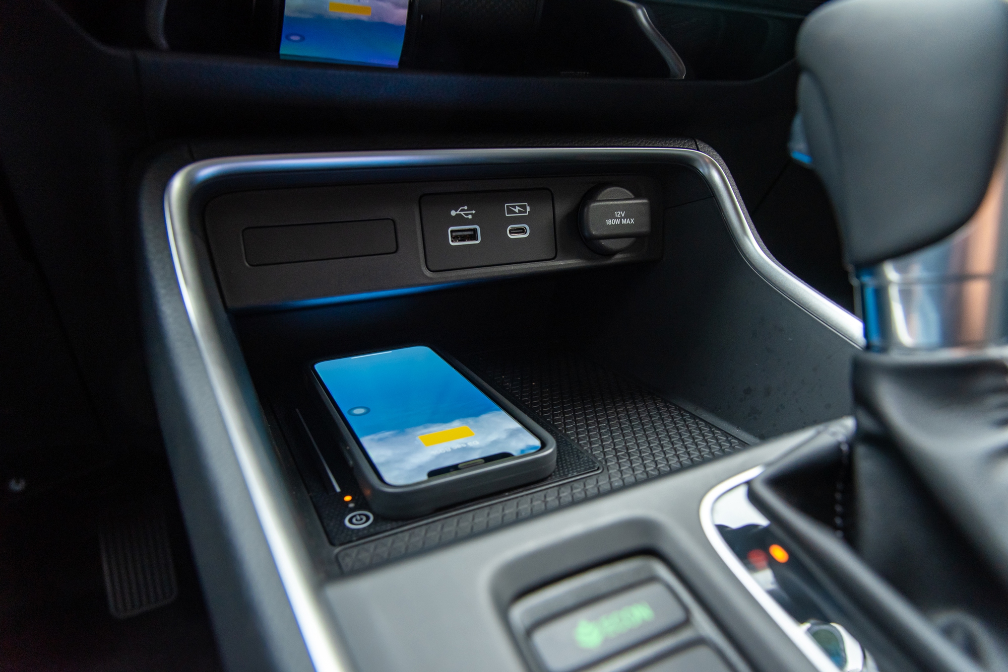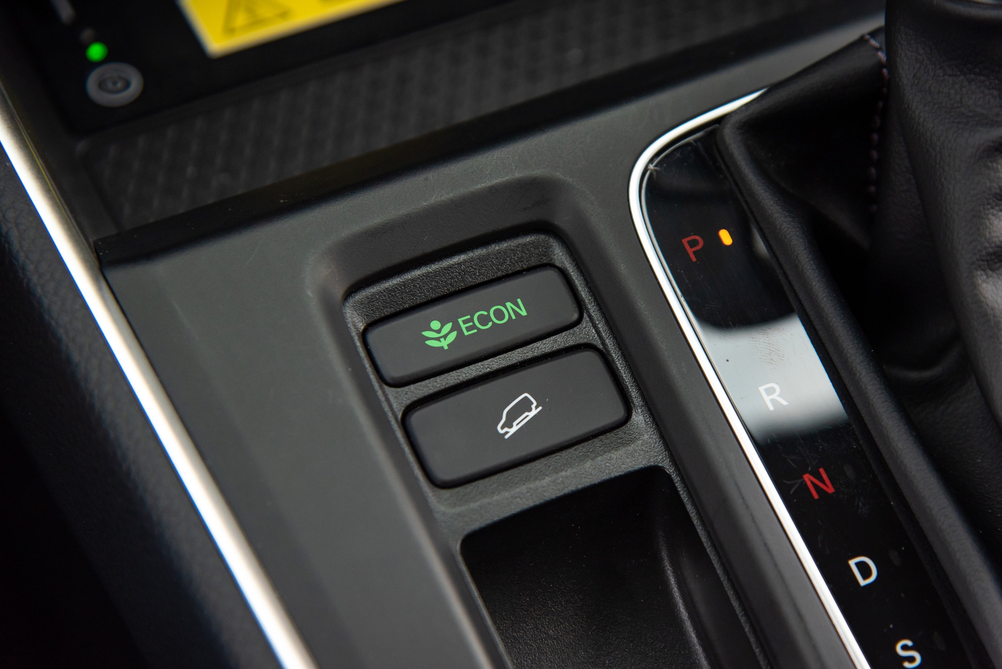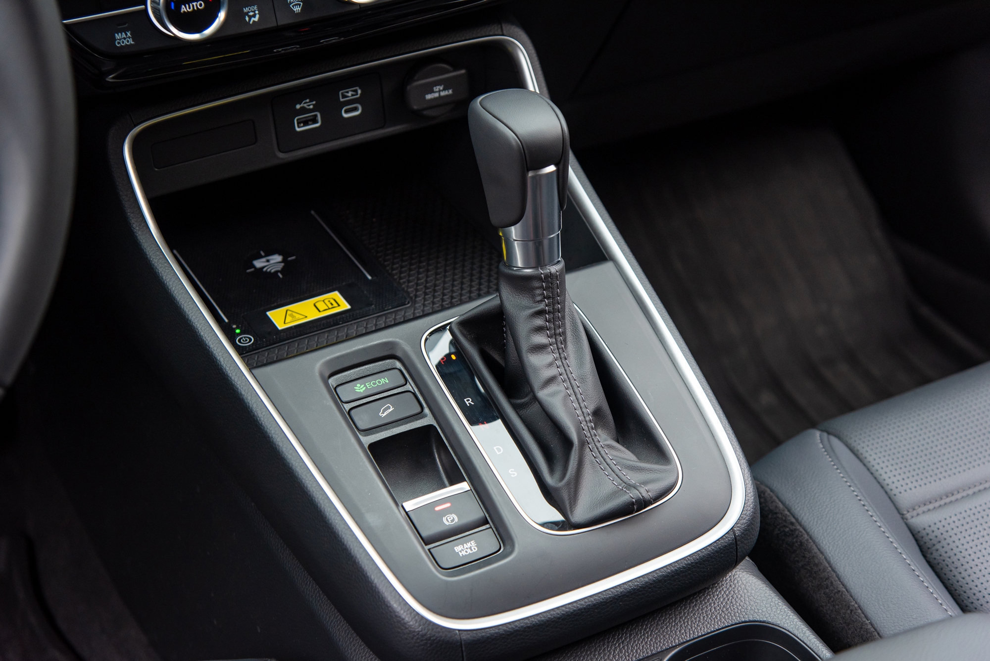 Khu vực cần số là thay đổi lớn của Honda CR-V 2024. Hãng xe Nhật đã bỏ đi kiểu đặt dốc ở trên táp-lô vốn không mấy thoải mái khi thao tác, mà chuyển xuống bệ trung tâm vừa tầm tay hơn. Xung quanh là các phím chức năng của chế độ lái ECON, hỗ trợ đổ đèo, phanh tay điện tử,... Phía trước là một ngăn chứa đồ rộng rãi, tích hợp sạc không dây.