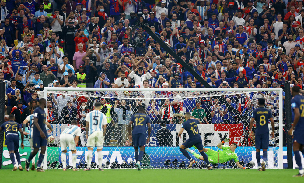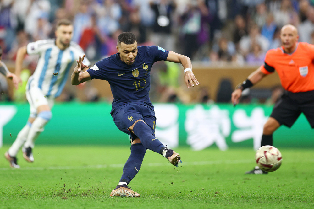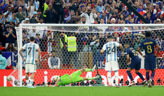 Một lần nữa Mbappe nhận trọng trách đá phạt đền cho ĐT Pháp, và một lần nữa cầu thủ mang áo số 10 hạ gục thủ thành E. Martinez từ cự ly 11m.