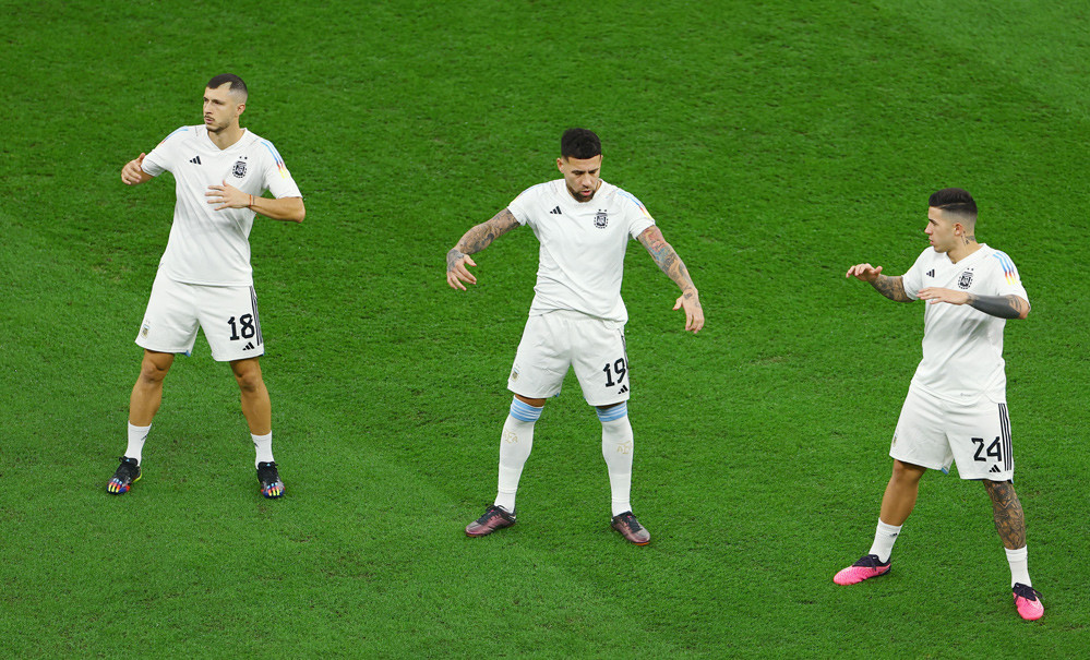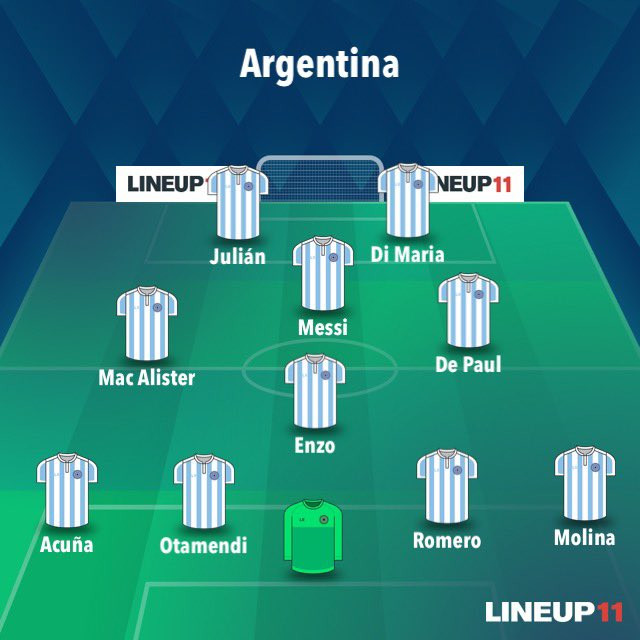 Argentina: E. Martinez; Molina, Romero, Otamendi, Acuna; De Paul, Enzo Fernandez, Mac Allister; Di Maria, Messi, Alvarez.