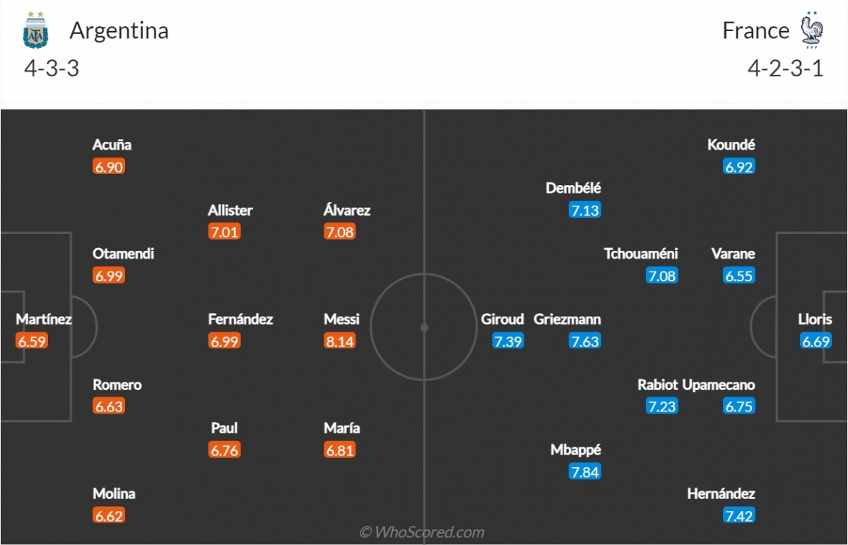 - Màn rượt đuổi tỷ số nghẹt thở giữa đôi bên cách đây 4 năm chính là lời hứa hẹn cho những diễn biến hấp dẫn trên sân Lusail, nơi số lượng CĐV Argentina dự kiến sẽ áp đảo CĐV Pháp trên khán đài (khoảng 40 nghìn so với 6 nghìn). Tuy nhiên, Pháp lại có điểm tựa là chiến thắng 4-3 trước Argentina ở vòng 1/8 World Cup 2018 trong ngày Kylian Mbappe che mờ Lionel Messi.