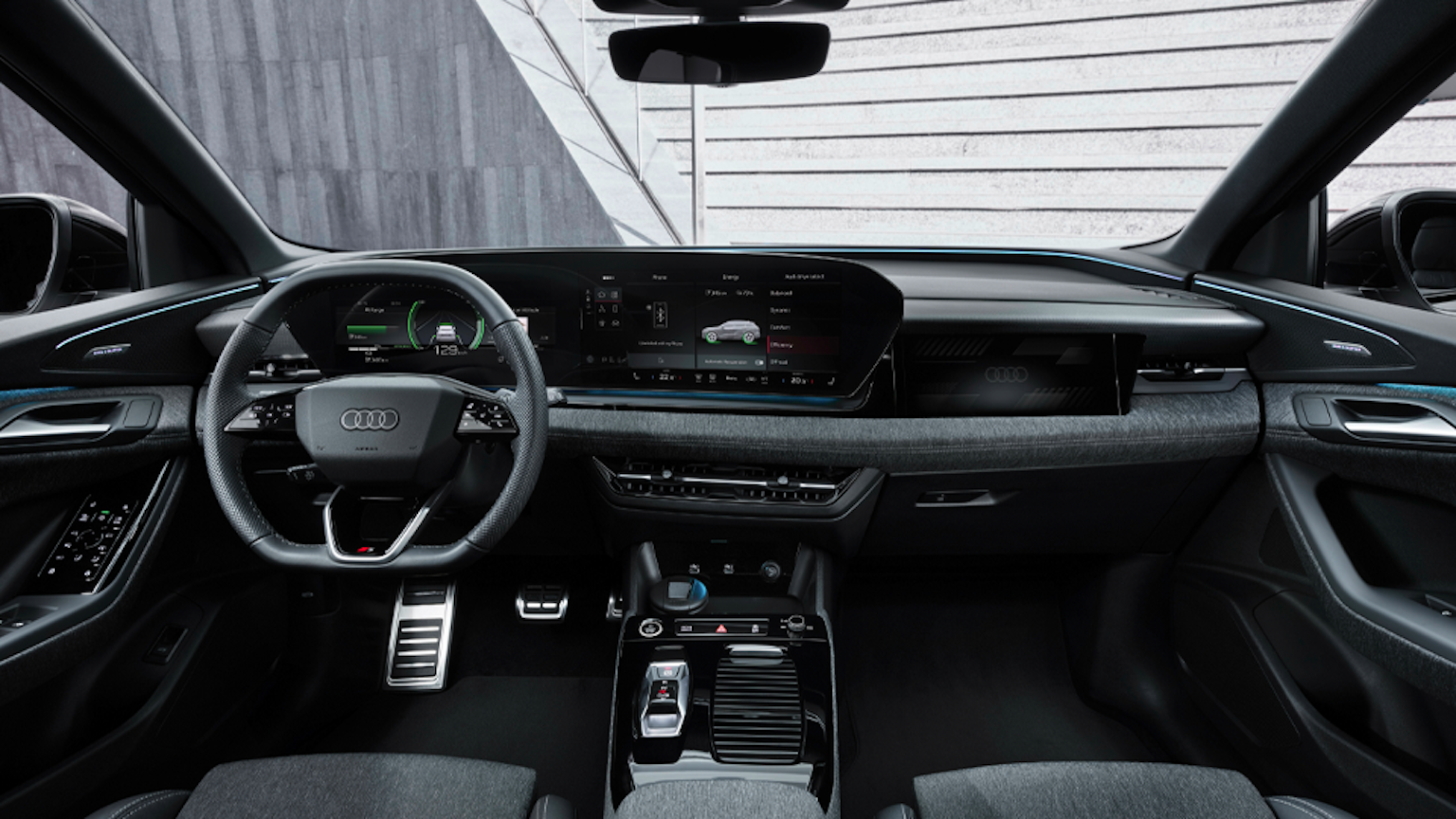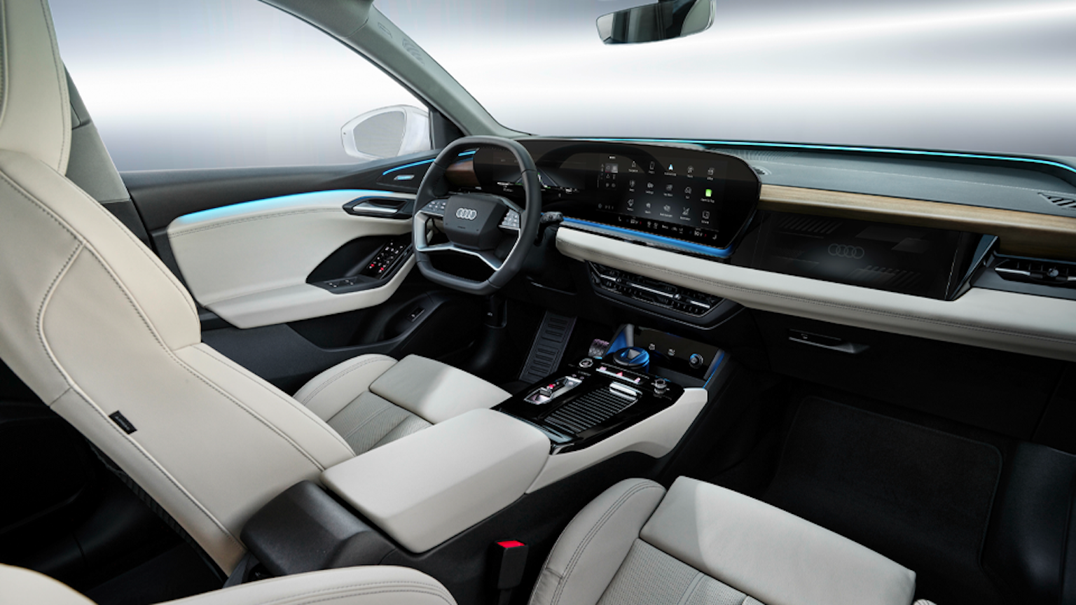 Trước mắt, Audi đã hé lộ nội thất Q6 e-tron. Khoang cabin xe khá hiện đại với 3 màn hình, gồm loại 11,9 inch sau vô-lăng, 14,5 inch trung tâm và một màn hình nữa kích thước 10,6 inch cho ghế phụ. Vô-lăng xe cũng có thiết kế tương tự Q4 e-tron.