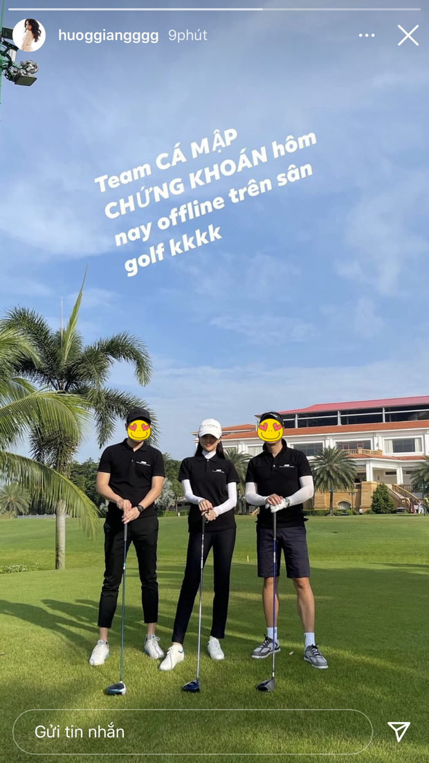 Gần đây, người đẹp còn đăng ảnh cùng 2 người bạn khá cao ráo, cơ bắp lên trang cá nhân và viết rất hào hứng: "Team cá mập chứng khoán hôm nay offline trên sân golf".