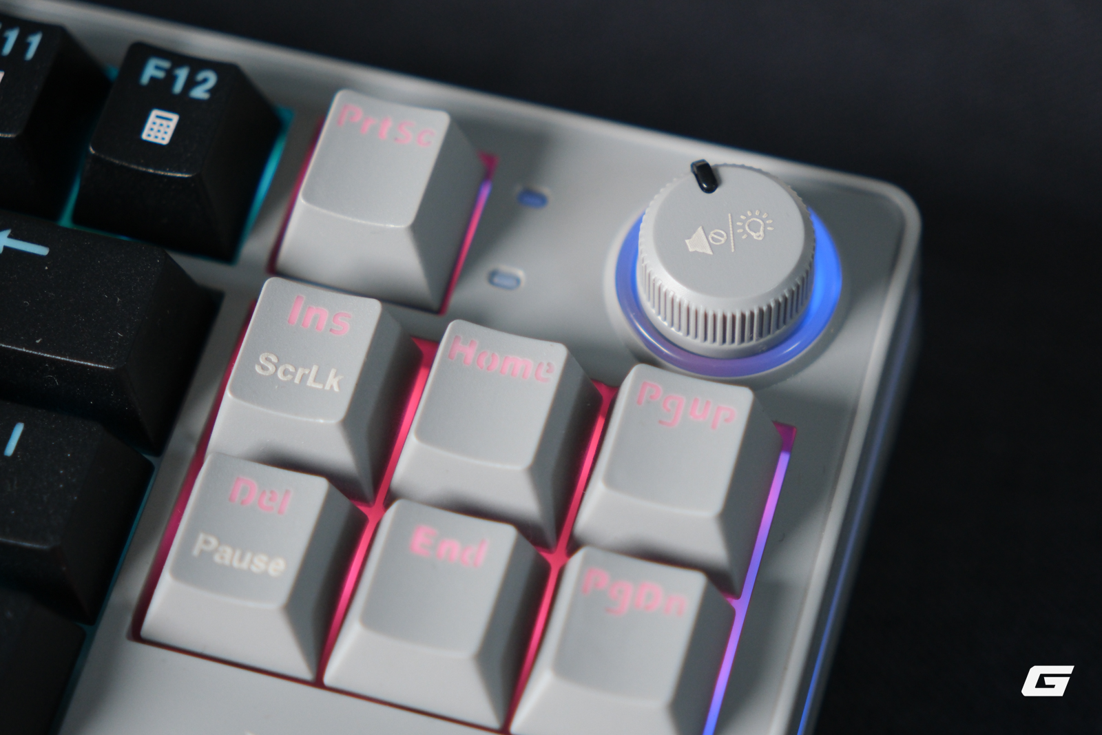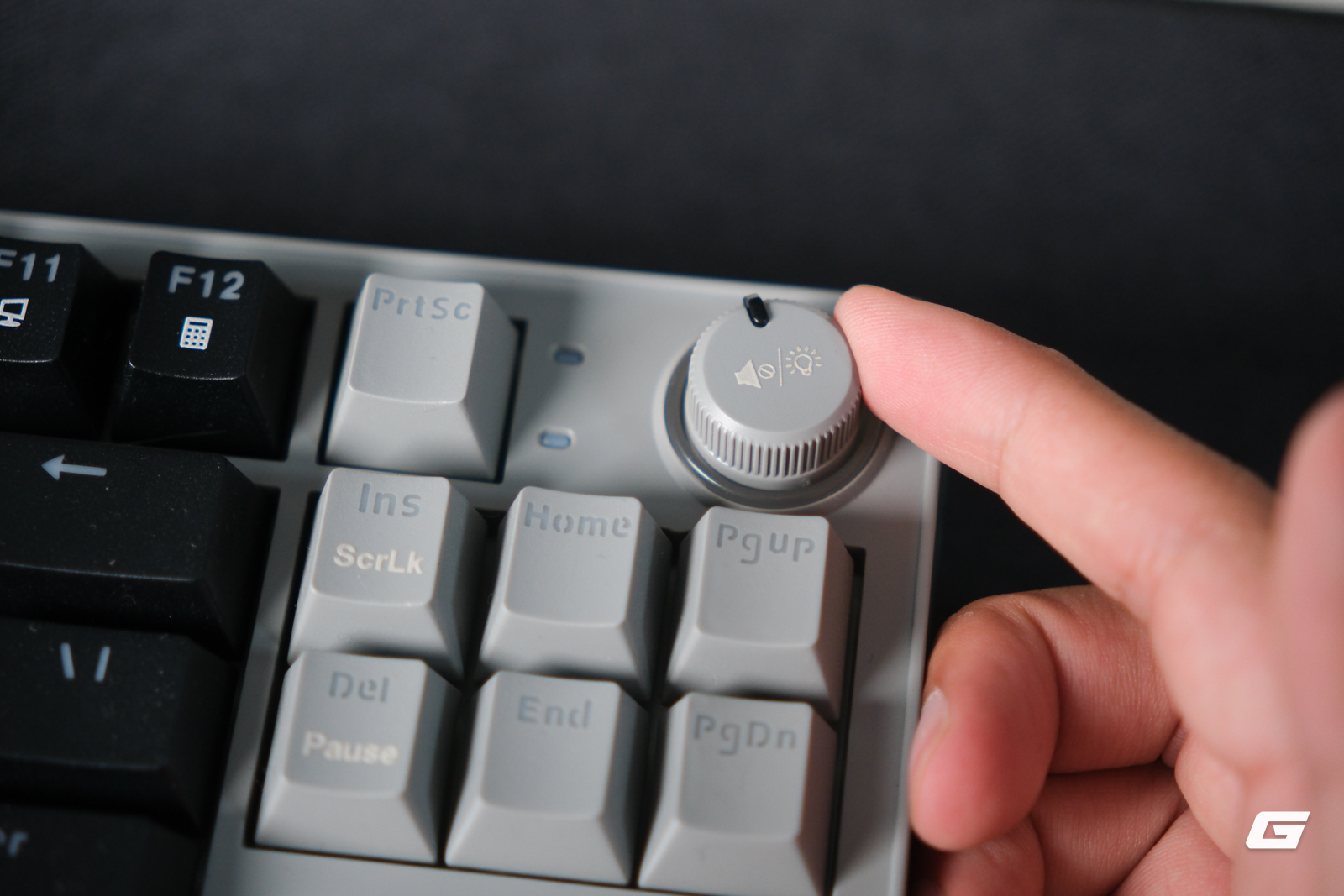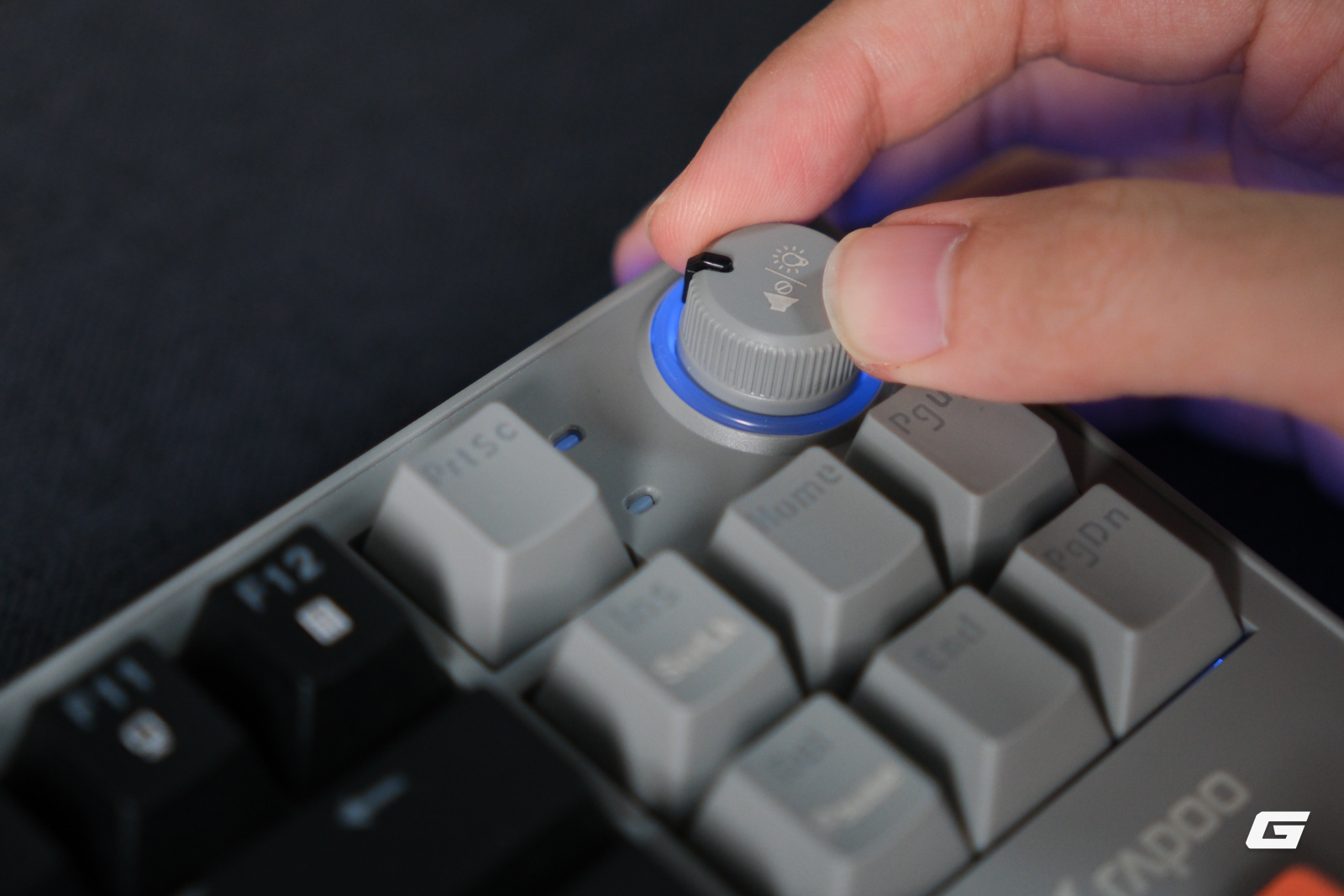 Ở tầm giá này, knob thường chỉ xuất hiện trên các mẫu đắt hơn đáng kể. Trên V501-87, núm xoay mặc định điều chỉnh âm lượng, nhưng cũng có thể chuyển sang kiểm soát độ sáng đèn nền tùy theo tổ hợp phím. Khi đặt tay lên thực tế, bước xoay của núm rõ ràng, phản hồi chắc - không bị lỏng hay mơ hồ như một số knob trên bàn phím tầm trung. Đây là kiểu tính năng người dùng nhận ra giá trị ngay từ lần dùng đầu tiên: chỉnh âm lượng bằng tay nhanh hơn hẳn so với tổ hợp Fn.