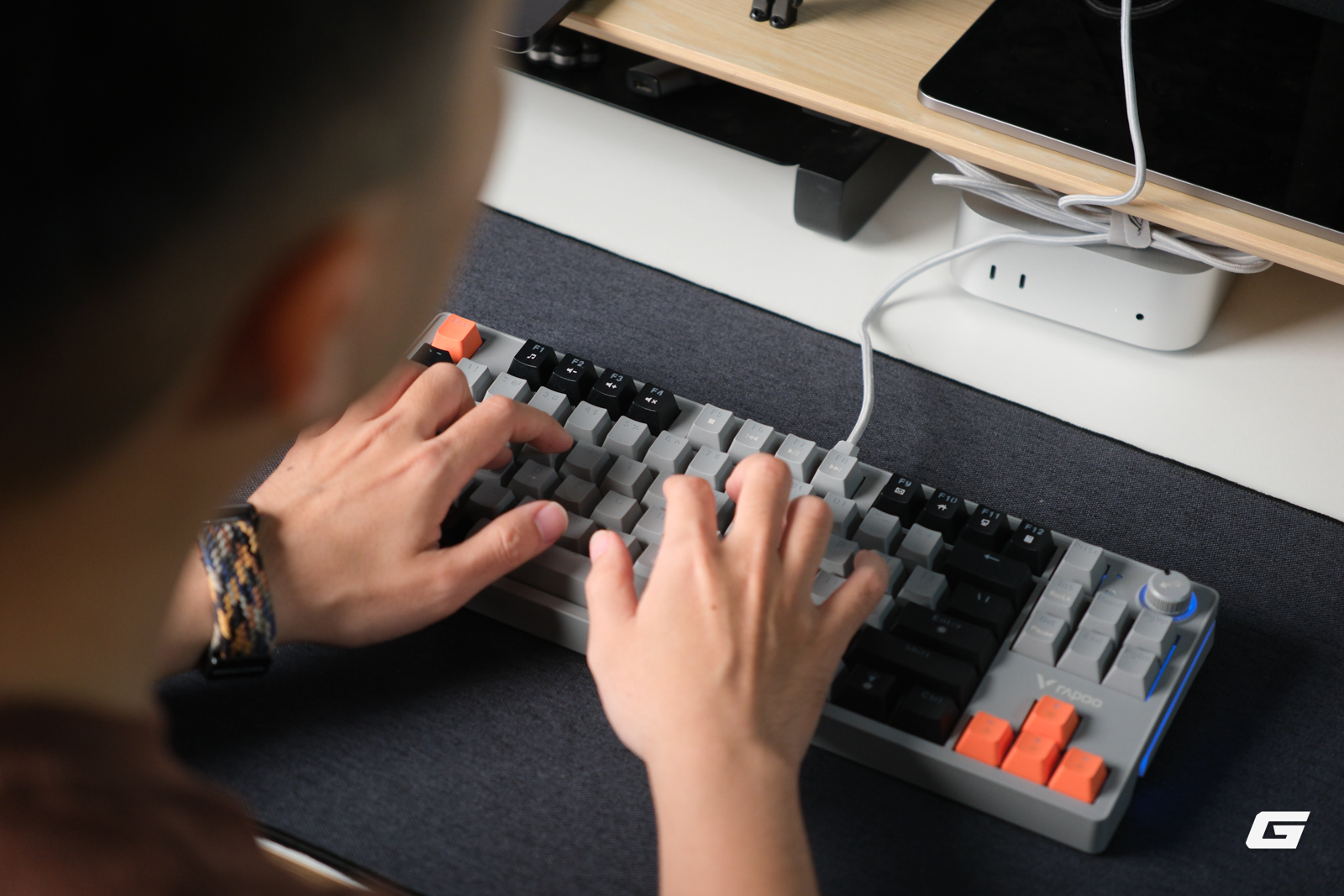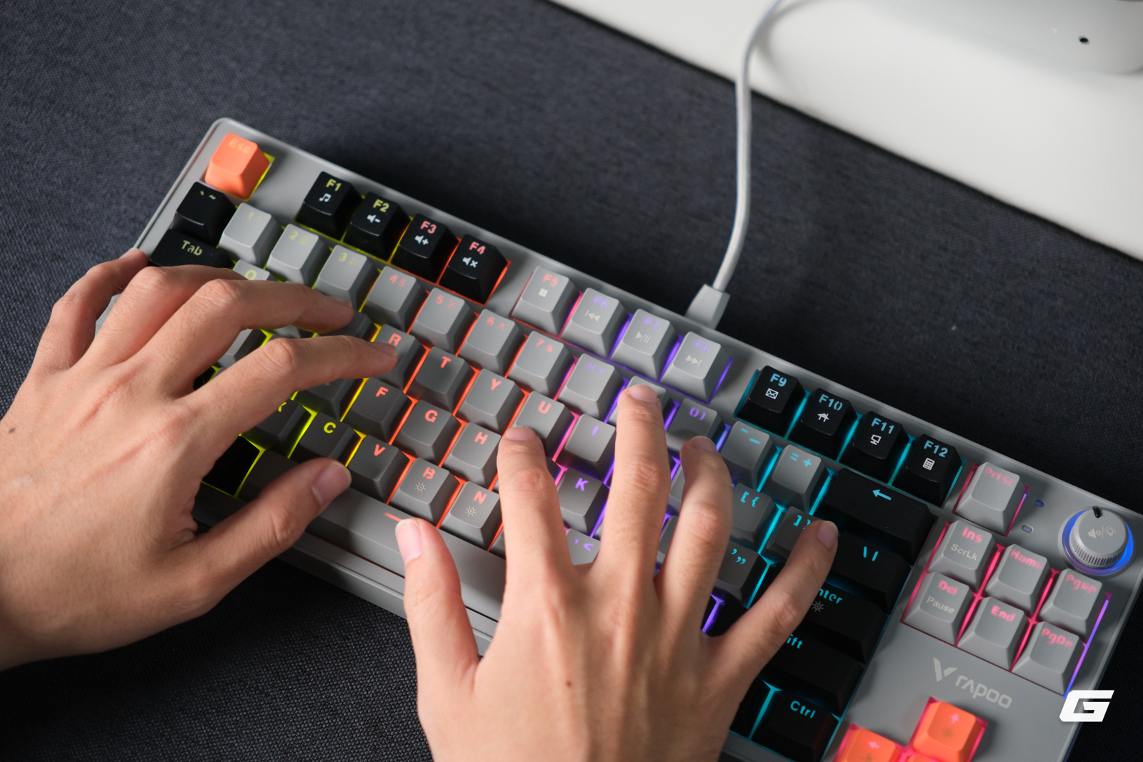 V501-87 dùng blue switch do Rapoo tự phát triển, với stem dạng box giúp ngăn bụi lọt vào buồng switch. Hành trình nhấn khoảng 4mm, lực kích hoạt ở mức trung bình - mỗi lần nhấn đều có điểm khấc rõ kèm tiếng click đặc trưng. Cảm giác gõ sinh động và phân biệt rõ với bàn phím màng, đúng kiểu "lần đầu dùng phím cơ là biết khác" mà người mới hay tìm kiếm. Switch có tuổi thọ công bố 60 triệu lần nhấn theo thông tin từ Rapoo, và không hỗ trợ hot-swap.