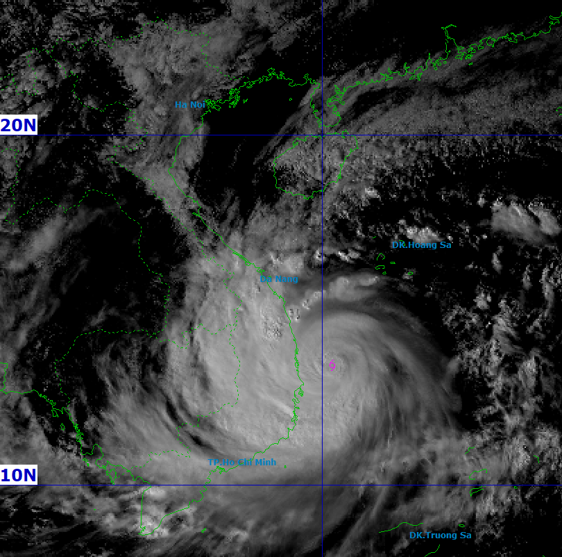 Vị trí tâm bão: Khoảng 13.7 độ Vĩ Bắc; 109.5 độ Kinh Đông, trên vùng ven bờ biển Đắk Lắk – Gia Lai.