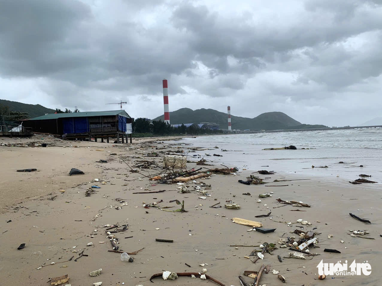 Sóng biển dữ dội cuốn theo rác thải lên bờ biển xã Kỳ Lợi - Ảnh: LÊ MINH