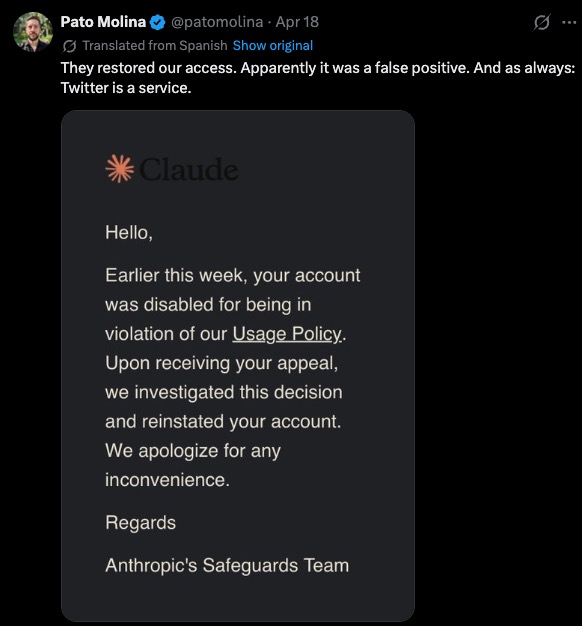 Phải mất hơn 15 giờ đồng hồ sau khi sự việc gây bão mạng xã hội, Anthropic mới chịu nhượng bộ. Molina chia sẻ bản cập nhật cuối cùng, thông báo quyền truy cập của Belo đã được khôi phục kèm theo một email xin lỗi từ hãng và giải thích ngắn gọn rằng hệ thống quét của họ đã "nhận diện nhầm".