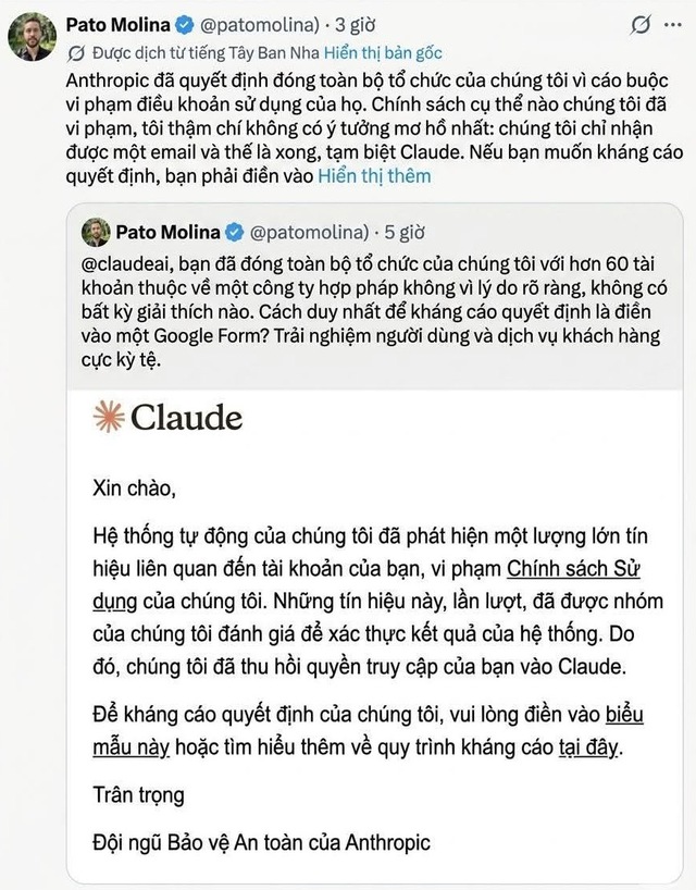 Để minh chứng, Molina đã chia sẻ ảnh chụp màn hình email thông báo từ Đội ngũ An toàn của Anthropic. Email viết: "Hệ thống tự động của chúng tôi đã phát hiện một lượng lớn tín hiệu liên quan đến tài khoản của bạn vi phạm Chính sách Sử dụng. Những tín hiệu này sau đó đã được đội ngũ của chúng tôi xem xét để xác thực các phát hiện của hệ thống. Do đó, chúng tôi đã thu hồi quyền truy cập của bạn vào Claude..."