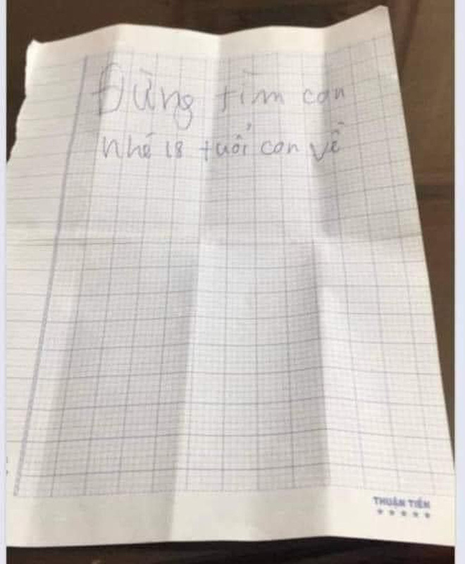 Trước khi đi, bé trai có để lại bức thư với dòng chữ viết tay nguệch ngoạc: "Đừng tìm con nhé. 18 tuổi con về".