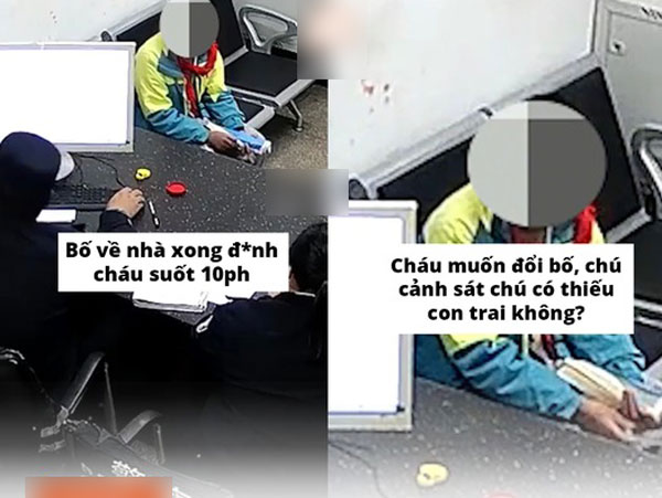 “Bố cháu về nhà rồi nói giống như trước kia, đánh cháu suốt 10 phút” - cậu bé còn đang đeo khăn quàng đỏ vừa khóc vừa trình bày lại với các chú cảnh sát.