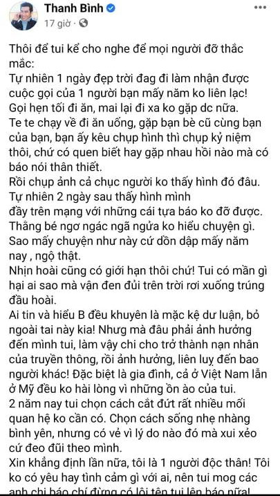 Cho đến trưa ngày 12/4, Thanh Bình phải lên tiếng vì những đồn đoán về mối quan hệ với Thắm Bebe. Anh viết đầy bức xúc: "Em chỉ muốn bình yên đi làm rồi về nhà thôi! Các anh chị báo chí truyền thông đừng thêu dệt rồi viết theo kiểu thuyết âm mưu được không ạ? Bạn bè mấy năm không gặp không liên lạc, gặp lại đi ăn uống có một bữa tối mà thành một câu chuyện li kì cục của các bạn! Tôi độc thân và không có nhu cầu yêu đương với bất kì ai nhé. Chọn cuộc sống ở ẩn rồi mà vẫn bị lôi vào! Để em tập trung làm nông dân nhé, cảm ơn nhiều ạ".