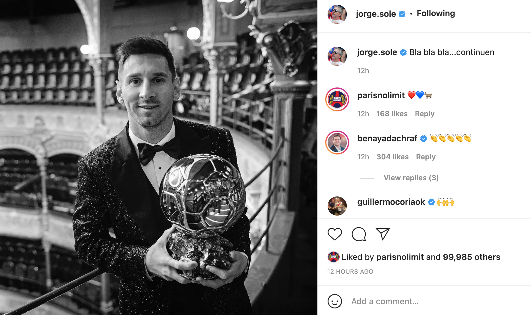 Ông đăng tải bức ảnh Messi chụp cùng danh hiệu Quả Bóng Vàng 2021 cùng dòng chú thích: "Bla bla bla... cứ tiếp tục nói đi". Đây được cho là động thái đáp trả những phản ứng của Ronaldo trên Instagram.