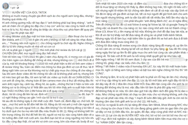 Theo bài chia sẻ rất dài của H.L được đăng tải trên trang cá nhân, chồng cô và hot Tiktoker nói trên đã lén lút qua lại được khoảng 2 năm. Người vợ vô tình phát hiện mình bị lừa dối khi xem được clip review Vũng Tàu của L., toàn những địa điểm mà chồng cô đã đưa vợ con đi.