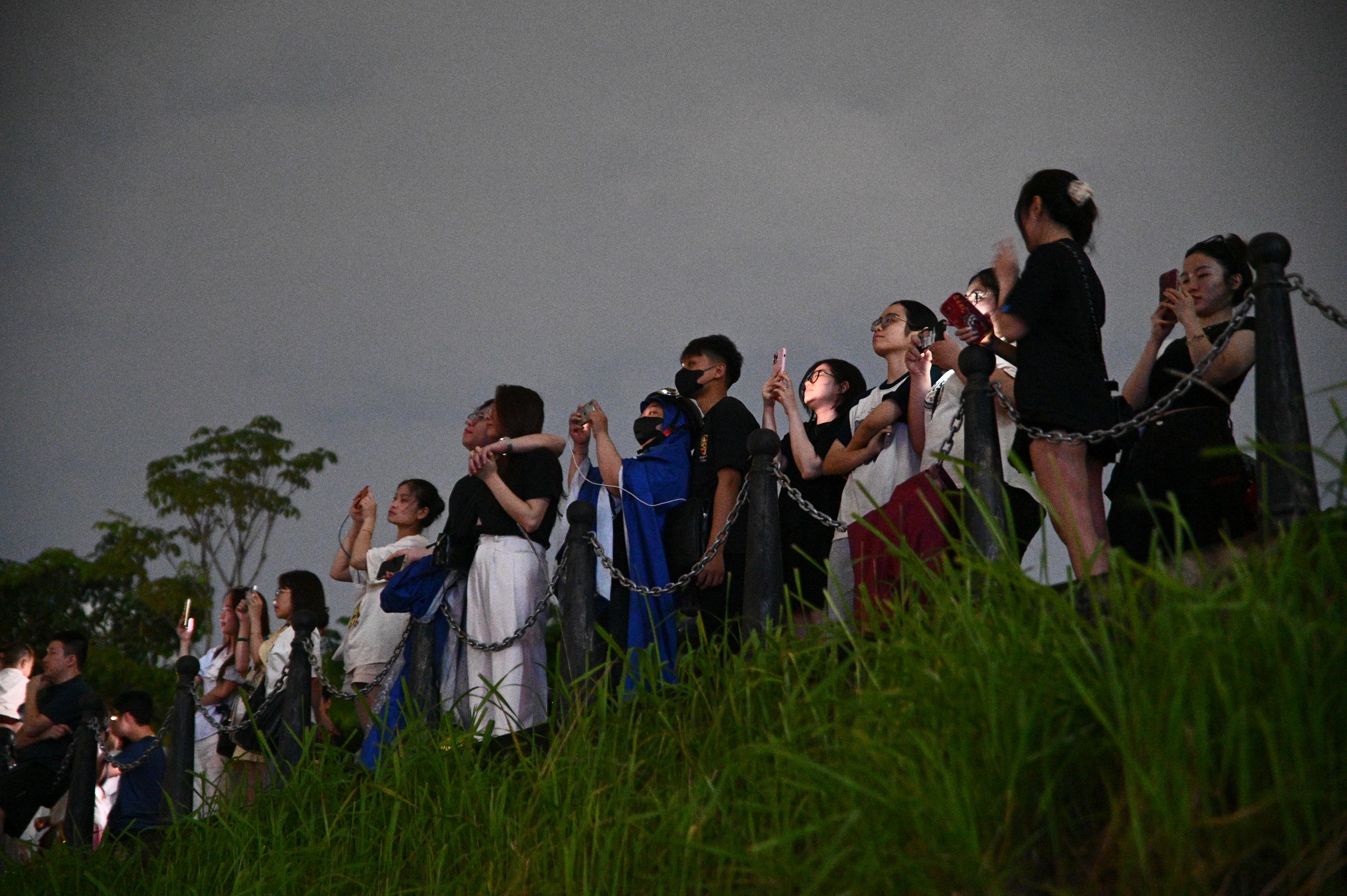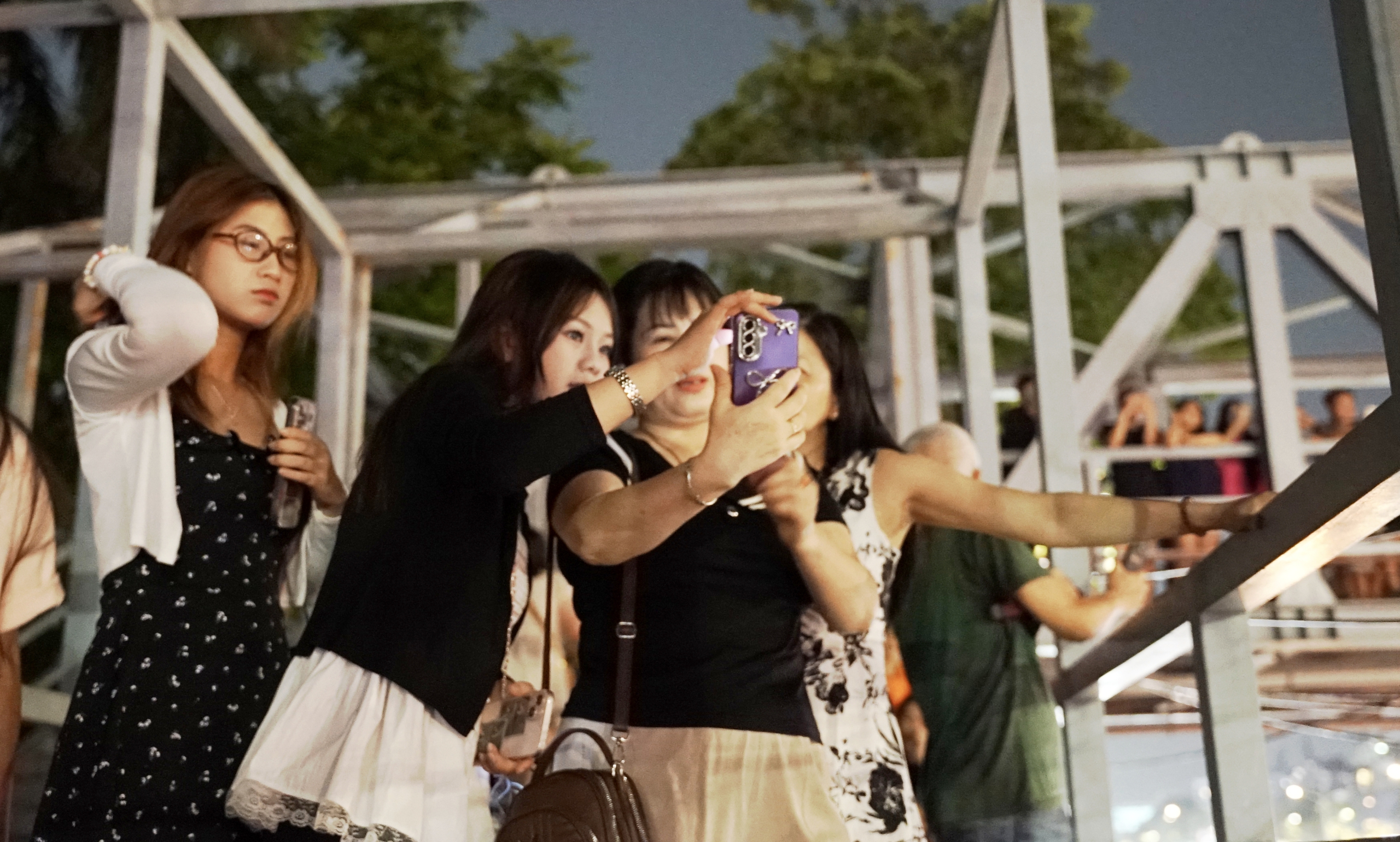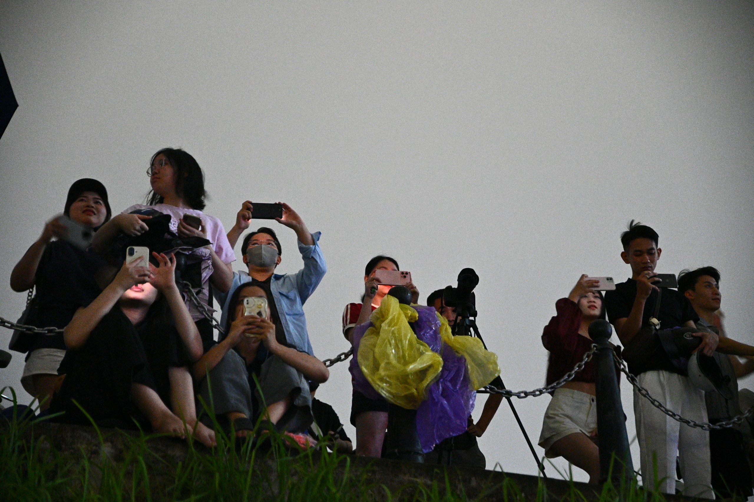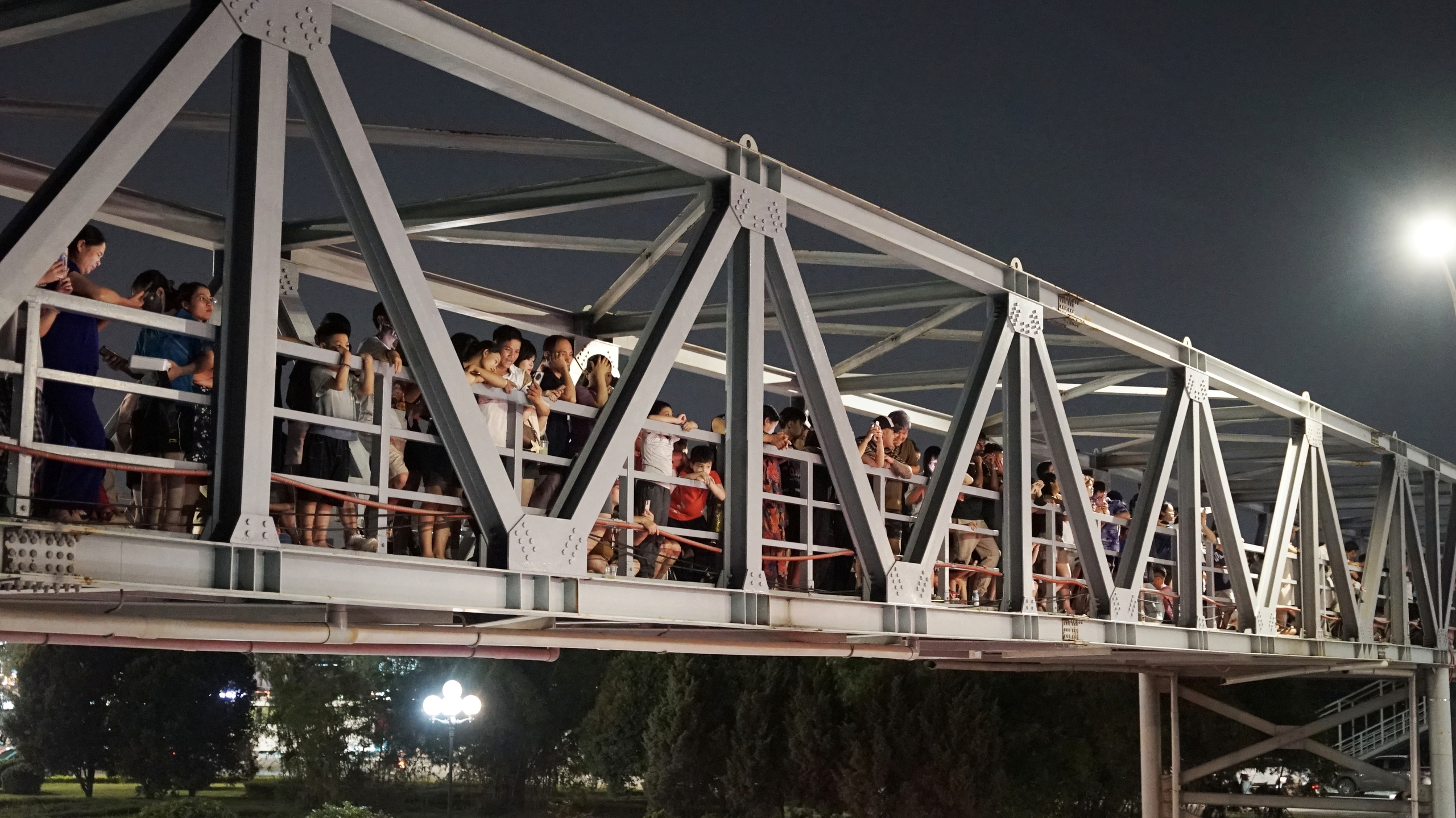 Dọc theo cầu đi bộ, dòng người đứng san sát, nhiều nhóm bạn trẻ và gia đình tranh thủ giữ chỗ từ trước khi chương trình bắt đầu