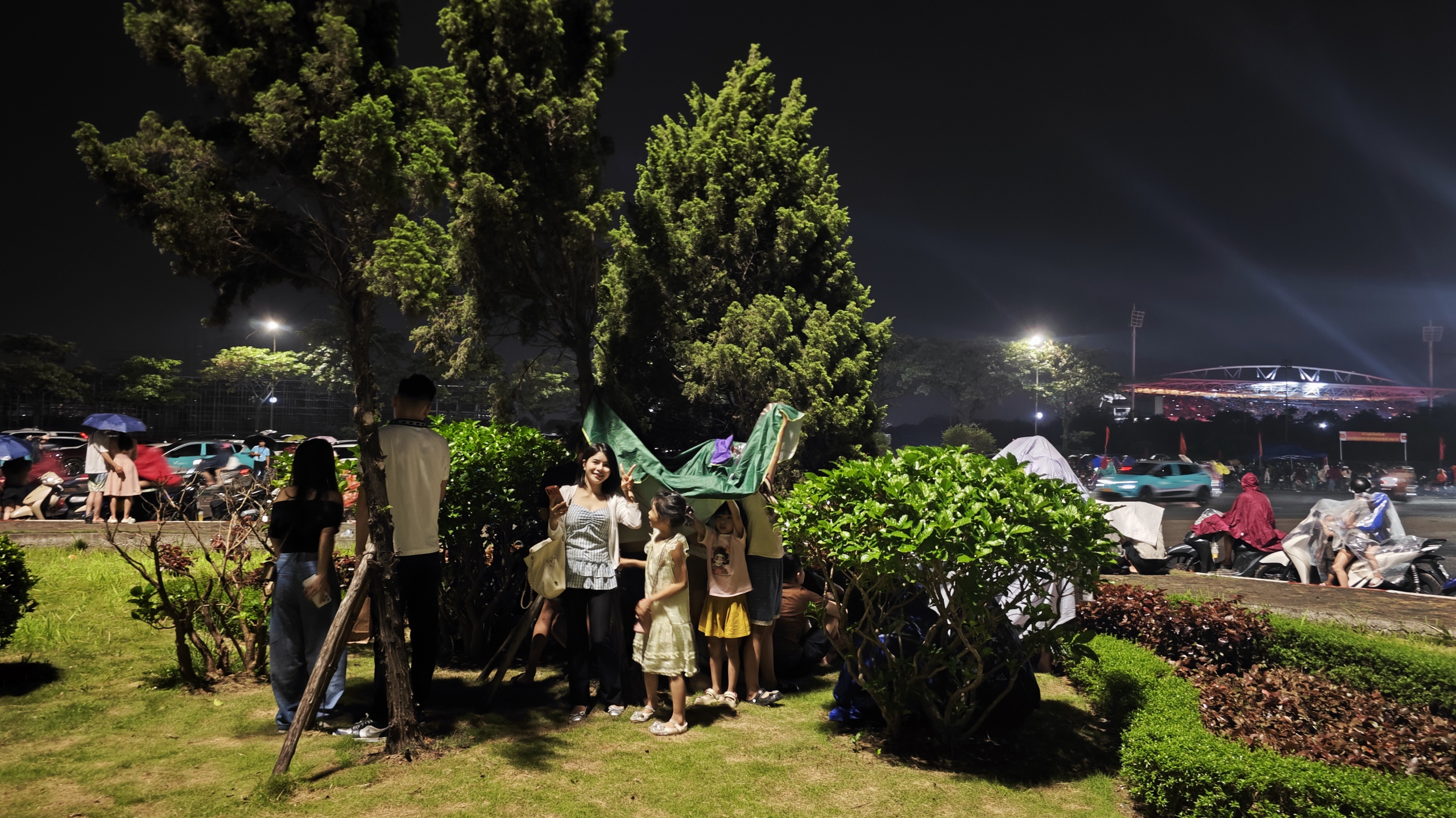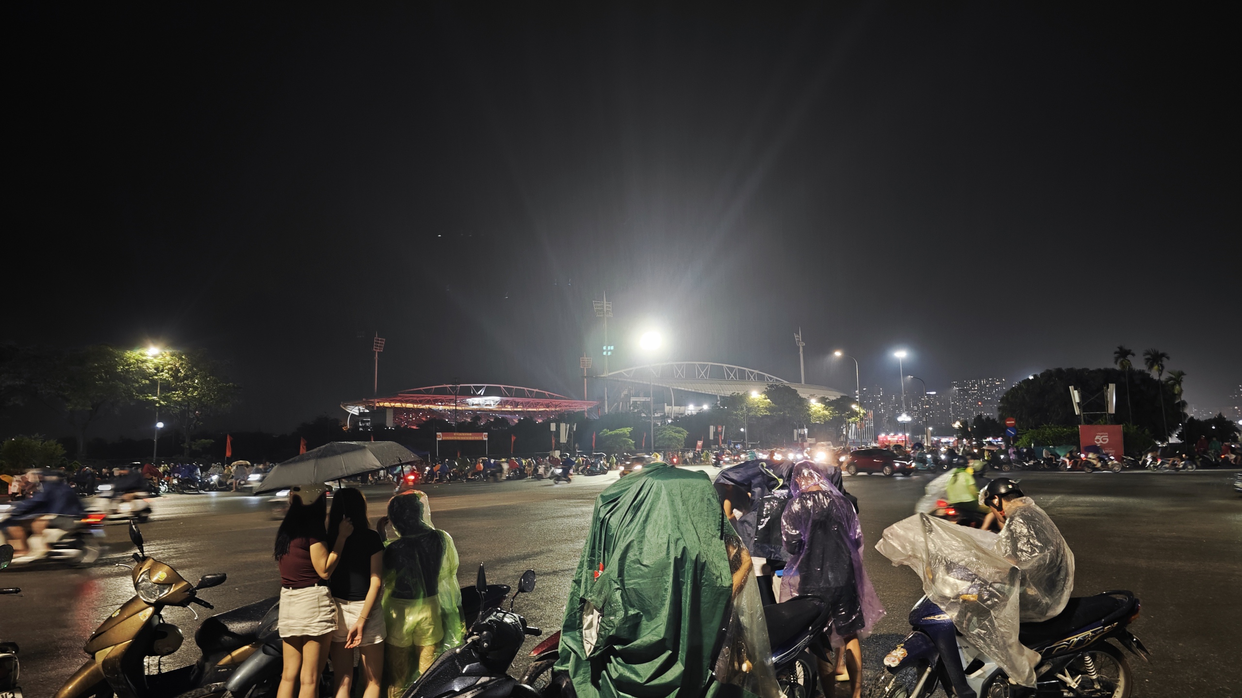 Khoảng 22h, khu vực quanh Sân vận động Quốc gia Mỹ Đình bất ngờ xuất hiện mưa lớn. Cơn mưa đổ xuống khá nhanh khiến nhiều người không kịp chuẩn bị áo mưa hay ô che.