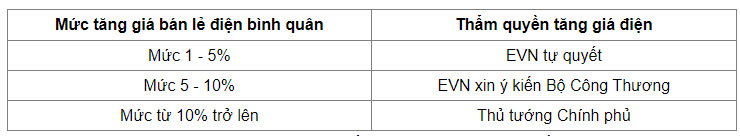 Trường hợp các thông số đầu vào làm giá bán lẻ điện bình quân tăng đến dưới 5%, EVN được quyền điều chỉnh tăng giá.