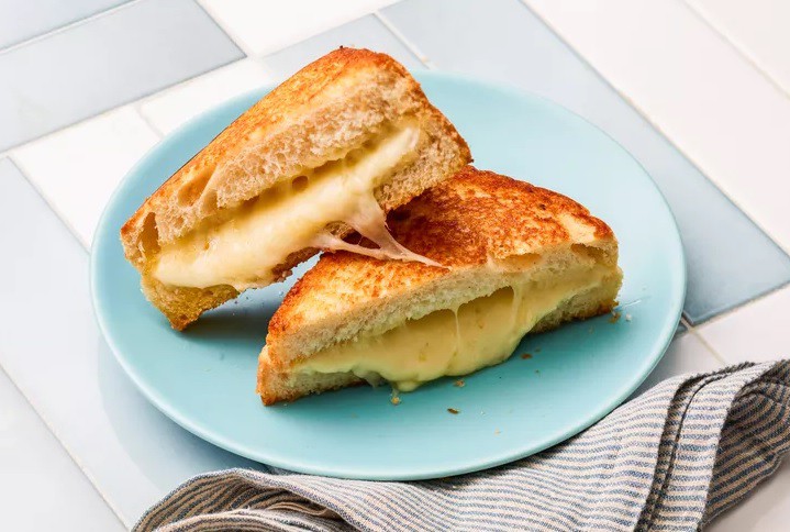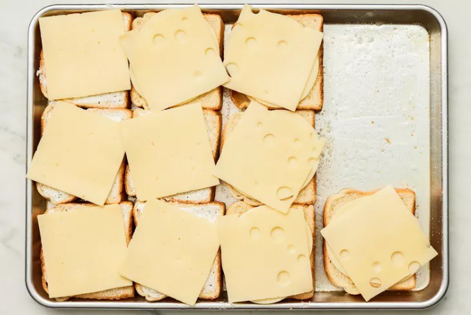 Bước 2: Trải đều phô mai lên 5 lát bánh mì theo thứ tự: cream cheese, cheddar, provolone rồi đến phô mai ở trên cùng. Xếp các lát bánh này trên phần bơ tan chảy ở khay nướng.