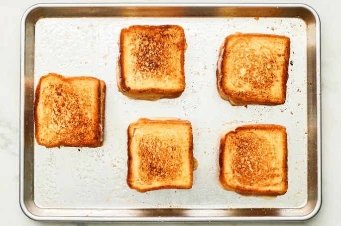 Bước 3: Úp 5 miếng bánh còn lại lên trên và bắt đầu nướng từ 3-4 phút, trong quá trình nướng, lật mặt bánh để 2 mặt giòn và vàng đều.