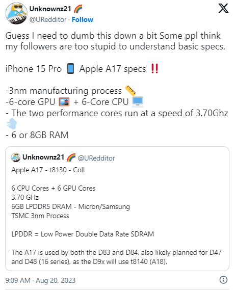 Nguồn tin chủ yếu tập trung vào quy trình sản xuất 3nm được sử dụng cho chip A17, sẽ cung cấp sức mạnh cho iPhone 15 Pro và iPhone 15 Pro Max. Với số nm càng nhỏ, hiệu năng của bộ xử lý càng tốt. Trước đó, chip A16 chỉ được sản xuất trên quy trình 4nm. Năm nay, chip A16 sẽ có trên iPhone 15 và iPhone 15 Plus tiêu chuẩn.