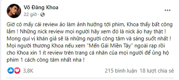 Mới đây, trên trang Facebook cá nhân "cha đẻ" Gái Mến Miền Tây, Võ Đăng Khoa cũng đăng tải dòng trạng thái tỏ rõ sự bức xúc cho rằng phim bị review ảo. Thậm chí, cháu trai Hoài Linh còn cho rằng nhiều người dùng nick ảo để review phim dù chưa xem. Võ Đăng Khoa cảm thấy những bình luận và review ảo là quá bất công với phim và ê-kíp. Anh chàng cũng kêu gọi khán giả đã xem phim, bình luận một cách công tâm về tác phẩm này.