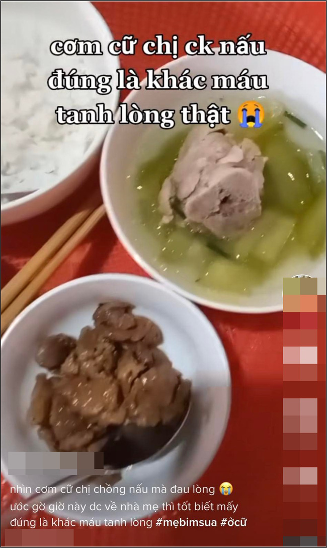 Mới đây, một nàng dâu đăng tải đoạn clip mâm cơm cữ rồi than thở: "Nhìn cơm cữ chị chồng nấu mà đau lòng. Ước gì giờ này được về nhà mẹ thì tốt biết mấy, đúng là khác máu tanh lòng".