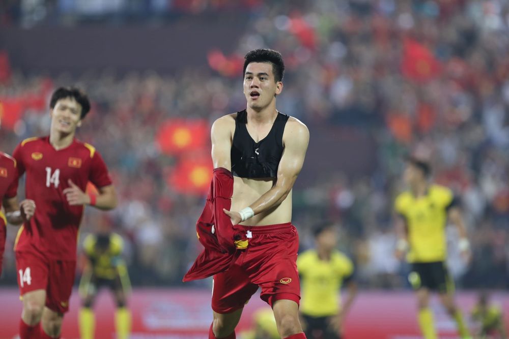 Sau bàn thắng đánh đầu tung lưới U23 Malaysia mở tỉ số cho ĐT Việt Nam, Tiến Linh đã chạy ra đường biên, cởi áo ăn mừng. Thế nhưng lần này, thay vì soi body xịn sò, dân mạng lại chỉ chú ý đến chiếc áo đen như áo crop top mà chân sút mang áo số 9 mặc bên trong.