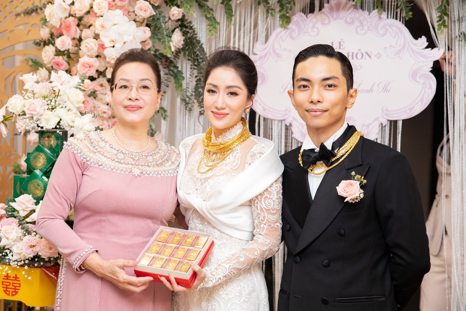 Ngoài ra, mẹ của Khánh Thi cũng góp mặt trong ngày trọng đại của con gái. Bà cũng dành của hồi môn cho Khánh Thi là 12 cây vàng. Sương sương của hồi môn của hai bên gia đình dành tặng Khánh Thi - Phan Hiển đã lên đến 22 cây vàng.