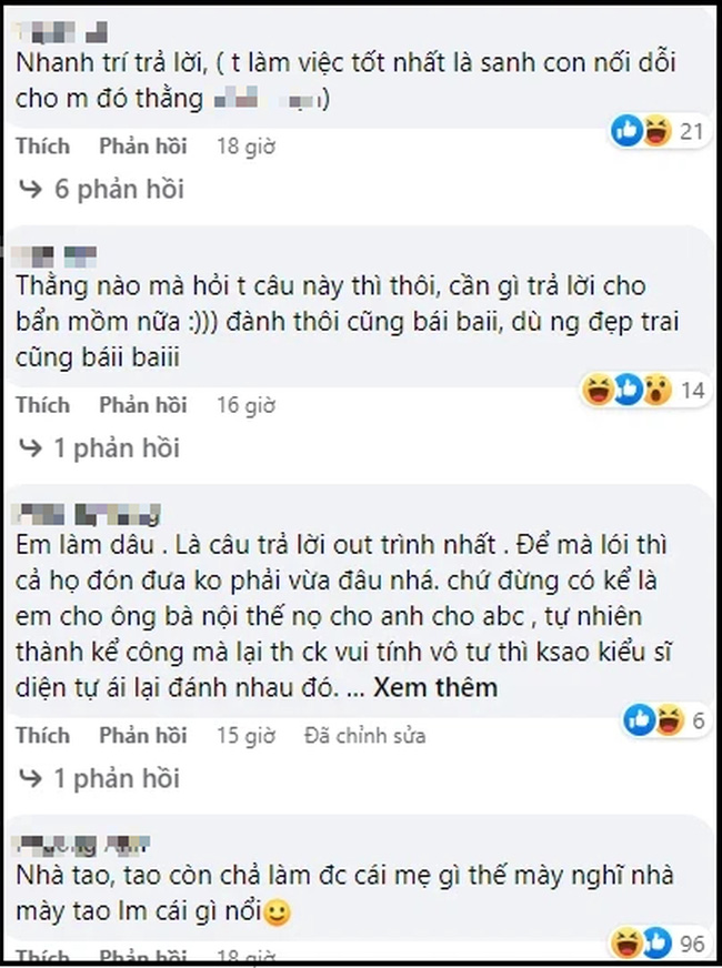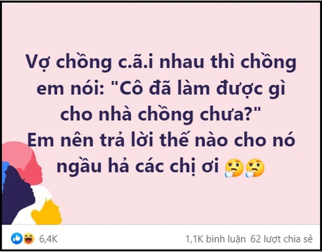 "Vợ chồng cãi nhau thì chồng em nói: 'Cô đã làm được gì cho nhà chồng chưa?'. Em nên trả lời thế nào cho nó ngầu hả các chị ơi?", câu hỏi hút 6,4 k like; 1,1 k bình luận chỉ sau vài giờ đăng tải. Có lẽ đây là tâm sự chung của rất nhiều chị em phụ nữ.