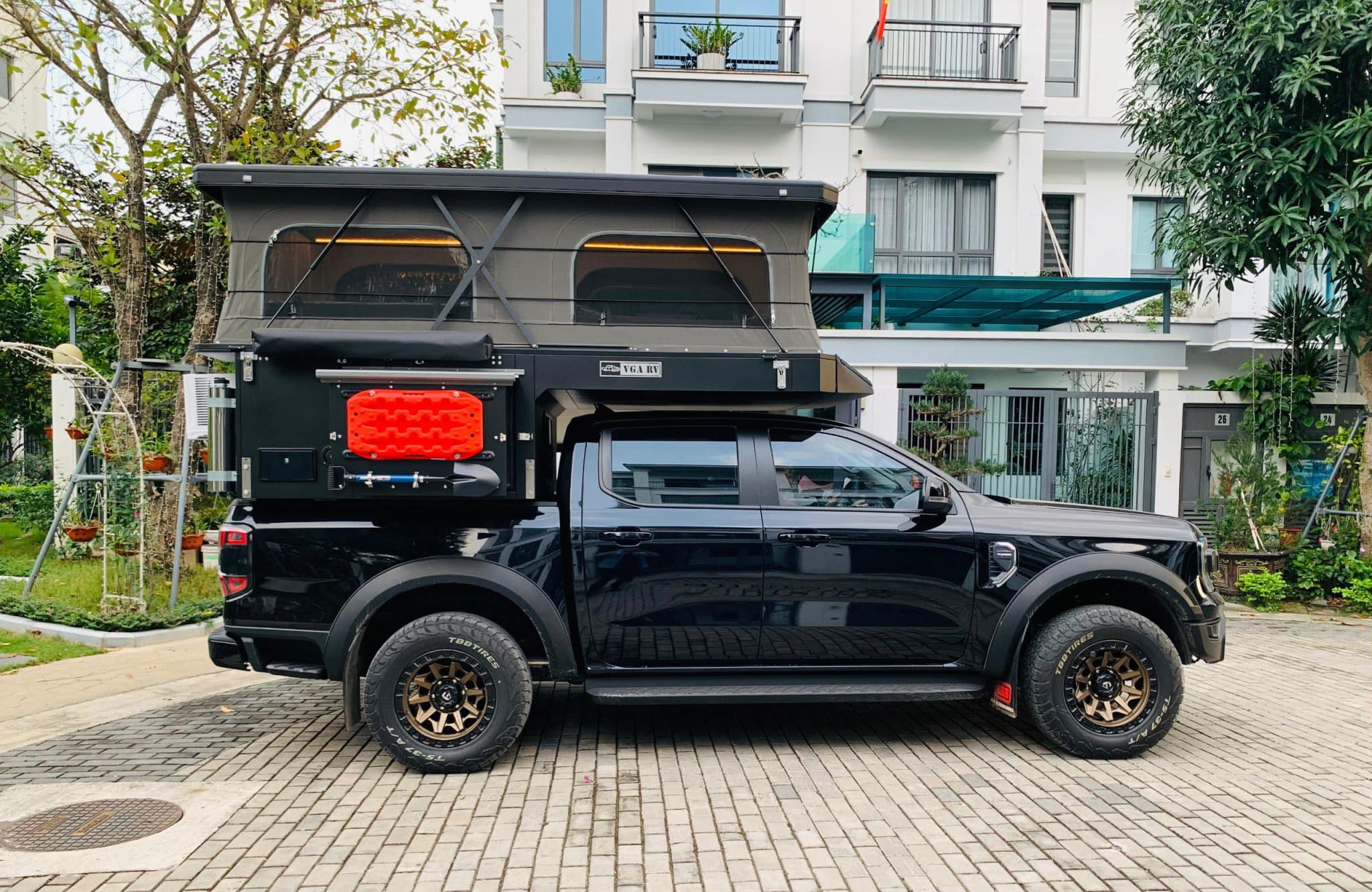 Nếu nhìn từ xa, có thể dễ nhầm chiếc Ford Ranger 2023 này là xe phục vụ mục đích chuyên dụng trong quân sự bởi có một nhà di động lớn gắn phía sau thùng.