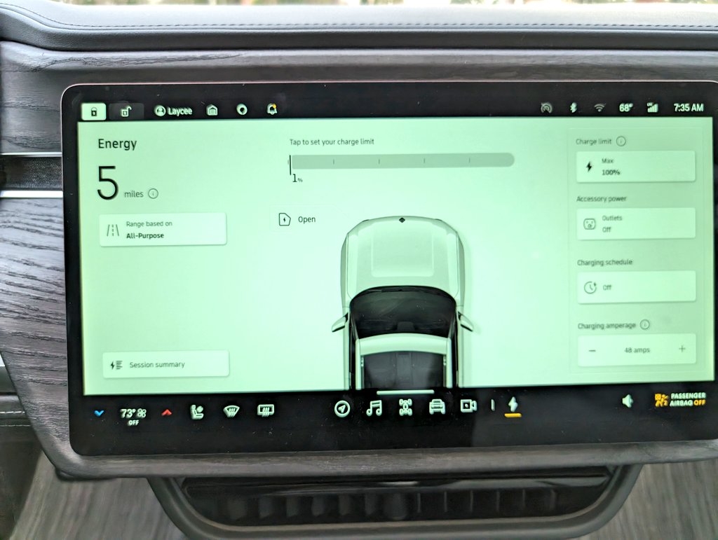 Rivian R1T Max Pack sở hữu bộ pin lớn, nên dù chỉ có 85% pin, Schmidtke vẫn có thể đi được khoảng 566 km. Nhưng khác với nhiều người, Laycee Schmidtke phải đi rất nhiều nên cô khá trông đợi việc sạc đầy một cách nhanh chóng. Ngoài ra, cô quan ngại mùa đông có thể ảnh hưởng đáng kể đến quãng đường đi trong thực tế.