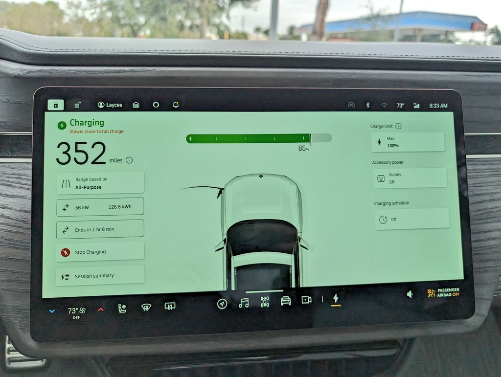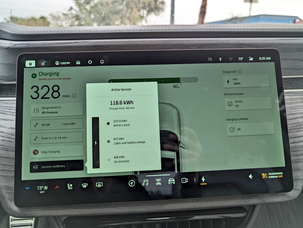 Vào thời điểm pin đạt 85%, công suất sạc chỉ còn chưa đến 50 kW. Lúc đó, hệ thống xe ước tính Rivian R1T sẽ mất thêm 1 giờ 8 phút nữa để đạt trạng thái 100%. Tức tổng thời gian sạc lên 100% là 1 tiếng 56 phút. Điều này khiến Laycee Schmidtke khá kinh ngạc.