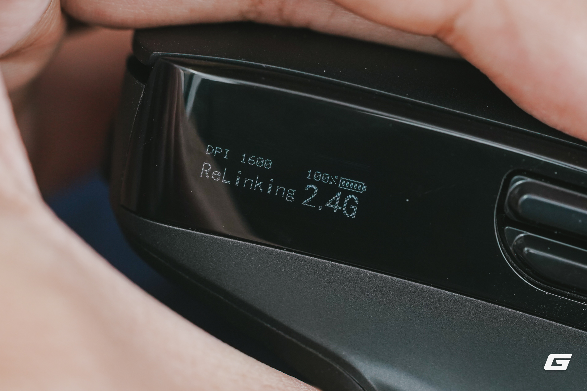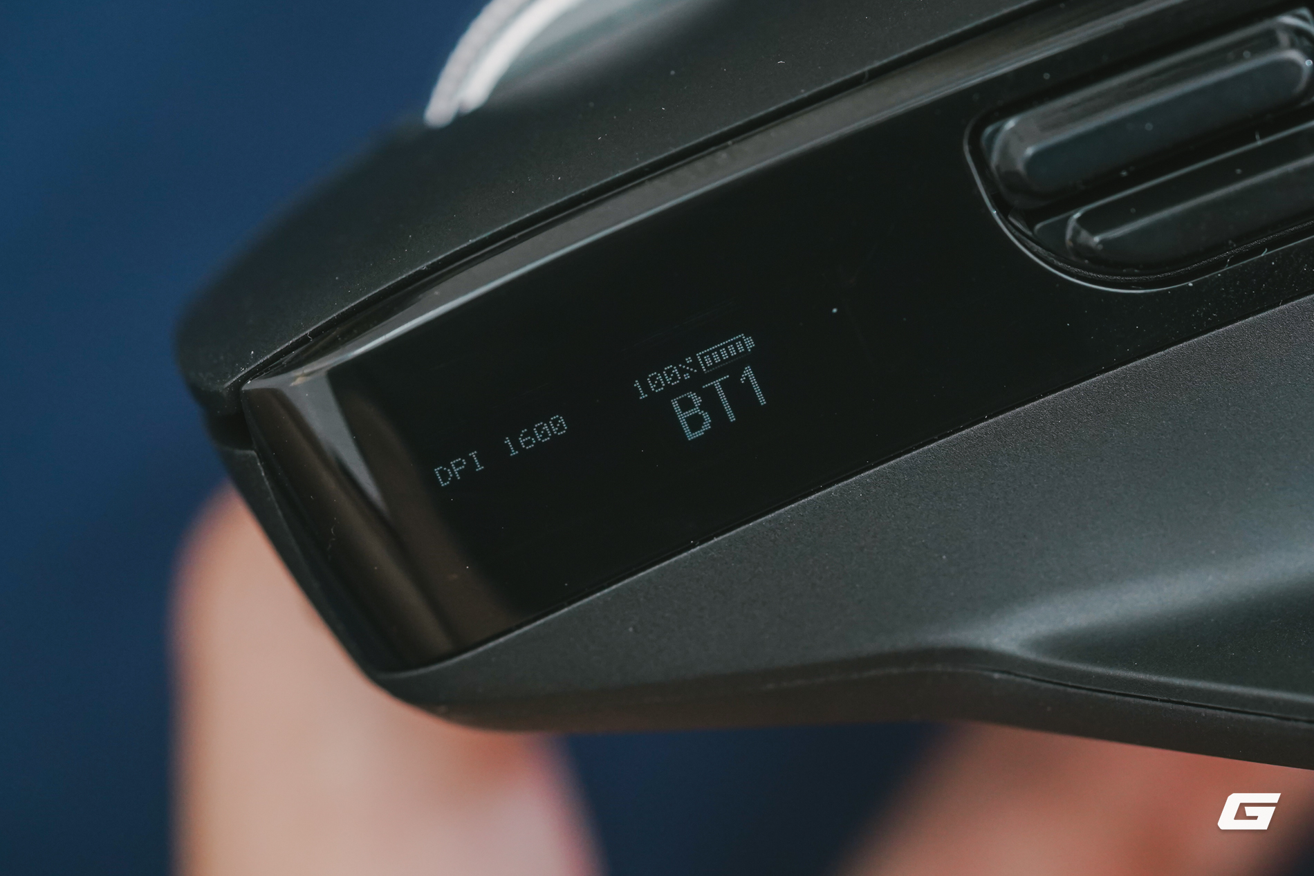 Điểm gây chú ý nhất trên Macro MS02 là màn hình hiển thị mini đặt ngay trên thân chuột. Màn hình này cho phép hiển thị các thông tin cơ bản như mức pin, DPI đang sử dụng và chế độ kết nối. Dù không phải yếu tố mang tính "thiết yếu", nhưng trong quá trình sử dụng thực tế, chi tiết này giúp người dùng kiểm soát trạng thái thiết bị trực quan hơn, hạn chế tình trạng hết pin đột ngột hoặc quên chuột đang ở chế độ Bluetooth hay 2.4GHz.