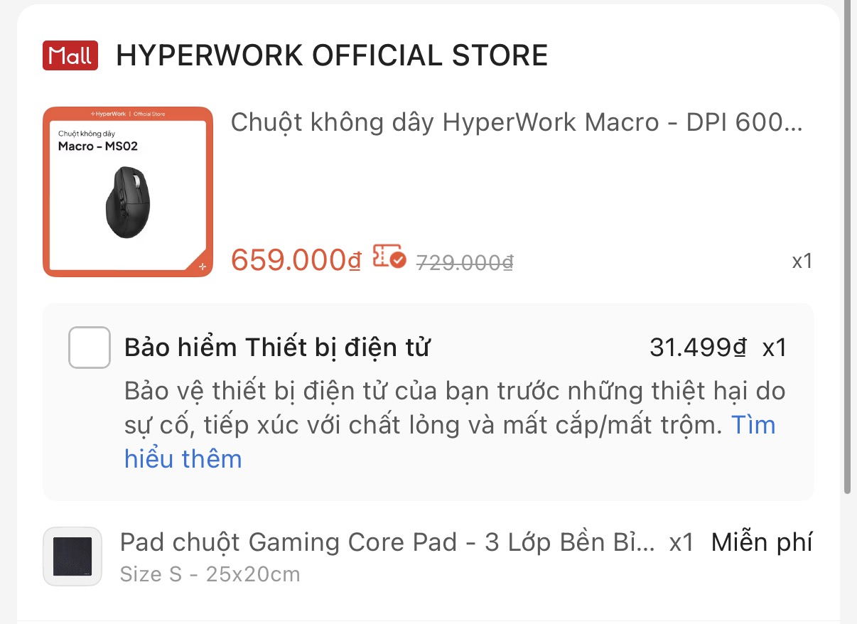 Về giá bán, HyperWork Macro MS02 được niêm yết ở mức 729.000 đồng. Tuy nhiên trên các sàn thương mại điện tử như Shopee, người dùng có thể áp mã giảm giá để đưa mức giá thực tế xuống chỉ hơn 600.000 đồng, cộng thêm quà tặng là Pad chuột Gaming Core Pad. Ở tầm giá này, việc sở hữu một mẫu chuột không dây công thái học, hỗ trợ macro, đa kết nối và có màn hình hiển thị riêng là điều khá hiếm.
