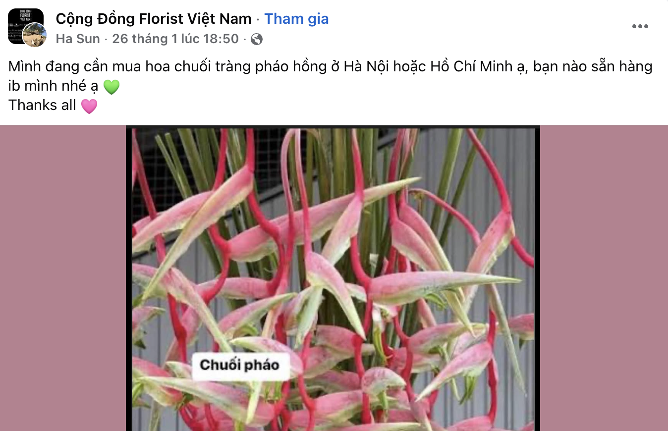Thậm chí trên mạng xã hội, chỉ cần search nhẹ một chút là thấy hàng loạt group chuyên mua bán, trao đổi hoa chuối mọc lên như nấm - từ group Facebook, Zalo cho đến TikTok và Instagram, chị em "săn" hoa, khoe bình cắm, chia sẻ tips chăm sóc liên tục. Độ "hot" này không phải ngẫu nhiên: vừa đẹp, vừa ý nghĩa, lại dễ phối với mọi phong cách nhà cửa. Đặc biệt, giá cả cực kỳ thân thiện - chỉ khoảng 80k/bông chuối búp tùy chất lượng và thời điểm mua, nên ai cũng dễ dàng rinh về nhà mà không lo "xót ví". Còn với chuối pháo thì giá nhỉnh hơn một chút, vào khoảng 120k - 200k/cành.