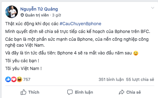 CEO Nguyễn Tử Quảng chia sẻ trong nhóm Bphone fan club.