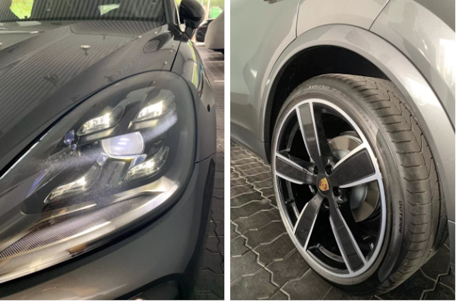 Porsche Cayenne S của đại gia Bình Dương sở hữu ngoại thất màu xám ánh kim. Điểm nhấn trên Porsche Cayenne S là bộ mâm 5 chấu đơn sơn đen kích thước 22 inch có giá lên tới 380 triệu đồng. Mức giá này gần bằng một chiếc VinFast Fadil. Cụm đèn full LED ma trận giá gần 122 triệu đồng, trong khi đèn LED hậu tiêu chuẩn.
