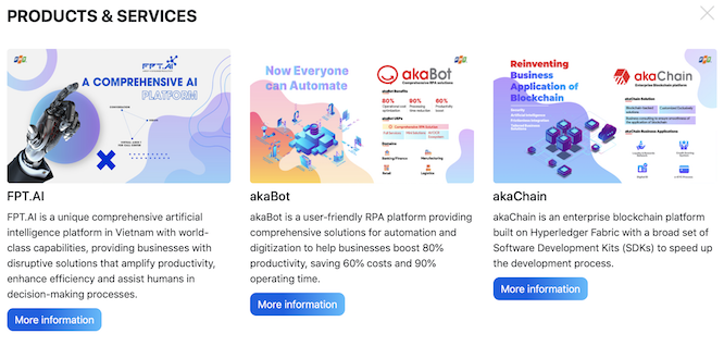 FPT.AI: Nền tảng cung cấp hệ sinh thái giải pháp dựa trên công nghệ lõi Trí tuệ nhân tạo (AI) giúp mang lại đột phá hiệu suất vận hành doanh nghiệp và nâng cao trải nghiệm khách hàng cho người sử dụng. FPT.AI đang là sự lựa chọn của hơn 70 tổ chức, doanh nghiệp lớn trong và ngoài nước như Bộ Y tế, Vietnam Airlines, Honda, HomeCredit, Prudential… với hơn 27.000 lập trình viên sử dụng thường xuyên, đem lại lợi ích cho hơn 11 triệu người dùng cuối. akaBot: Nền tảng hỗ trợ tự động hóa quy trình nghiệp vụ cho những công việc có khối lượng lớn, lặp đi lặp lại bằng robot phần mềm. Hơn 20 khách hàng từ 6 quốc gia đang sử dụng akaBot qua đó tiết kiệm đến 90% thời gian xử lý công việc và 60% chi phí vận hành, đồng thời gia tăng 80% năng suất. akaBot được xếp trong Top 30 sản phẩm RPA (Tự động hóa quy trình bằng robot) toàn cầu. akaChain: Nền tảng hỗ trợ các doanh nghiệp xây dựng nhanh hệ thống mạng lưới kinh doanh thông qua ứng dụng phân tán bằng công nghệ chuỗi khối (blockchain). Điểm vượt trội của nền tảng là rút ngắn thời gian triển khai các nghiệp vụ như: định danh khách hàng điện tử (eKYC), chấm điểm tín dụng (credit scoring), chương trình khách hàng thân thiết (loyalty) và truy xuất nguồn gốc.Liên quan đến bảo mật, FPT giới thiệu Giải pháp Giám sát an toàn và phản ứng sự cố FPT.EagleEye MDR tiên phong về công nghệ, giúp giám sát an toàn và phản ứng sự cố tự động theo phương thức dịch vụ ứng dụng phần mềm (SaaS). FPT.EagleEye MDR đã giúp các doanh nghiệp, tổ chức phát hiện hàng trăm sự cố về an toàn, bảo mật thông tin và ngay lập tức đưa ra cảnh báo, phương án xử lý kịp thời.