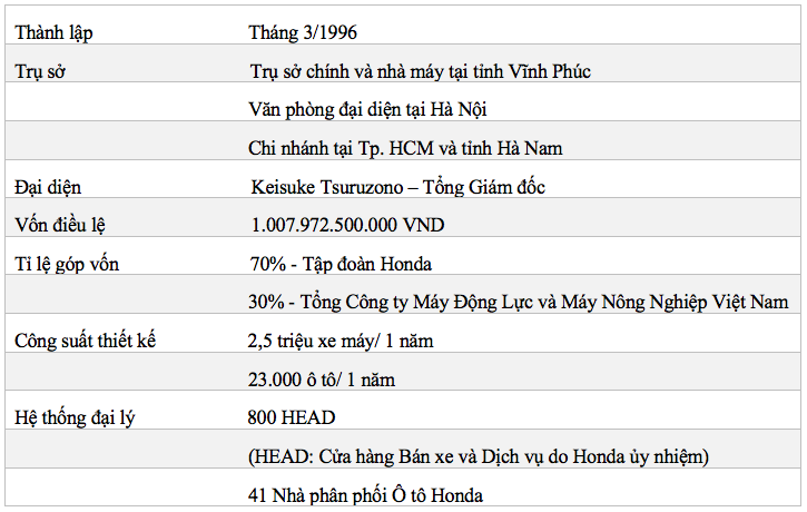 Kể từ khi thành lập vào năm 1996 với tư cách là nhà sản xuất và phân phối các mẫu xe máy của Honda, HVN đã luôn nỗ lực hết mình để cung cấp những sản phẩm và dịch vụ với chất lượng cao cùng giá thành hợp lý, vượt ngoài những mong đợi của khách hàng. Công ty chính thức đi vào sản xuất năm 1997 tại nhà máy đặt tại tỉnh Vĩnh Phúc, được đánh giá là một trong những nhà máy chế tạo xe máy hiện đại bậc nhất trong khu vực Đông Nam Á. Nhằm phục vụ cho nhu cầu ngày càng gia tăng của khách hàng, HVN đã mở rộng các hoạt động kinh doanh và nâng cao cơ sở vật chất, cũng như tăng tỷ lệ nội địa hóa cho những mẫu xe sản xuất trong nước. Hiện tại, với 03 nhà máy xe máy, nhiều phân xưởng và 01 trung tâm phụ tùng, HVN sản xuất khoảng 2,5 triệu xe máy hàng năm. Các mẫu xe sản xuất trải dài qua nhiều dòng xe từ xe số, xe tay ga đến xe côn tay như: Wave Alpha, SH, VISION, WINNER X,…