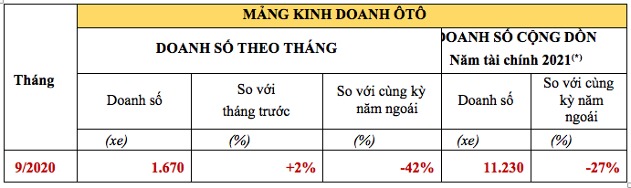 Từ tháng 4 tới hết tháng 9/2020, doanh số cộng dồn của ôtô đạt 11.230 xe, giảm 27% so với cùng kỳ năm ngoái.