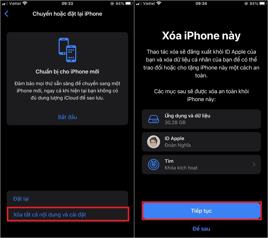 Bước 2: Bước tiếp theo bạn chọn vào phần Xoá tất cả nội dung và cài đặt -> Chọn Tiếp tục.