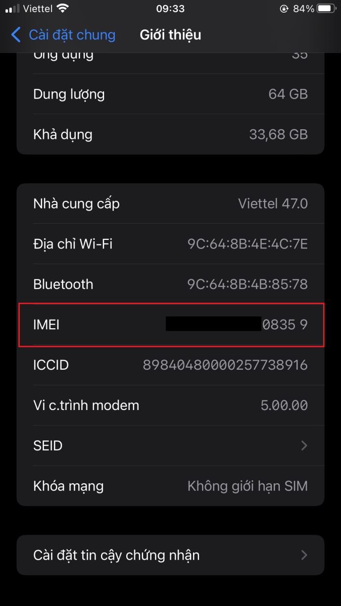 Bước 2: Sau đó bạn kéo xuống phần iMei để xem số iMei của máy.