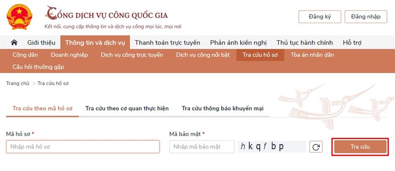 Bước 3: Tiếp theo đó bạn nhập Mã hồ sơ. Tại mục này bạn nhập Mã hồ sơ của mình và mã xác thực để thực hiện tra cứu hồ sơ.