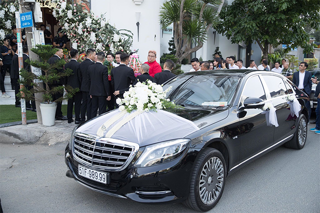 Chiếc xe ông xã Bảo Thy sử dụng để rước dâu là xe sang thuộc dòng Maybach S600. Giá bán của chiếc xe này tại thị trường Việt Nam khoảng 15 tỷ. Đây là dòng xe cao cấp được các doanh nhân ưa chuộng.